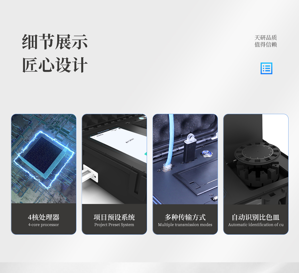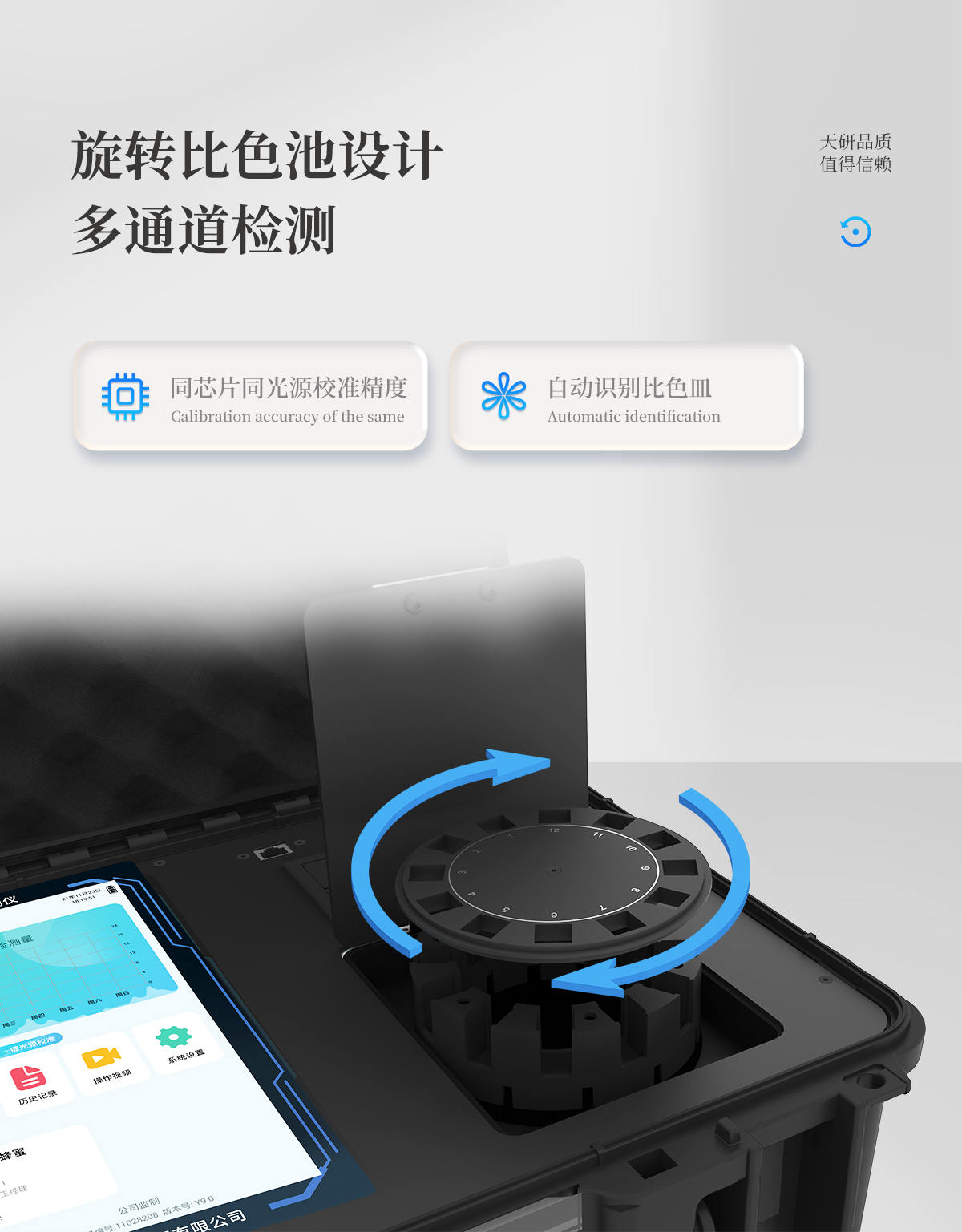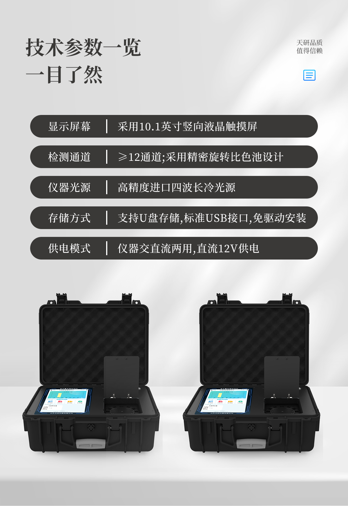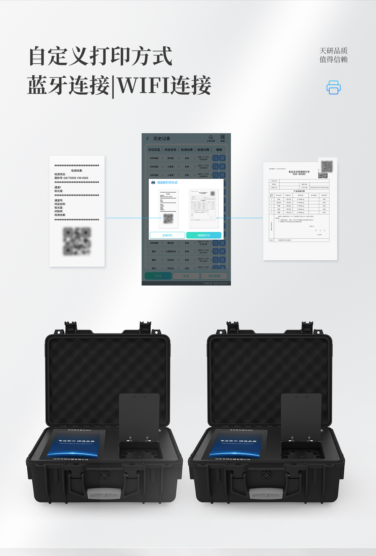| 儀器采用手提一體化系統(tǒng)檢測(cè)技術(shù),將分光光度模塊、數(shù)字化管理模塊、無(wú)線通訊模塊高度集成于一體,可支持檢測(cè)60種食品安全檢測(cè)項(xiàng)目,同時(shí)預(yù)留升級(jí)檢測(cè)方法。 | 儀器檢測(cè)模塊標(biāo)準(zhǔn)化、智能化,檢測(cè)項(xiàng)目可隨意自由組合。檢測(cè)箱體內(nèi)置多個(gè)標(biāo)準(zhǔn)檢測(cè)單元,檢測(cè)模塊可以調(diào)整配置。 | 儀器采用全新安卓智能系統(tǒng),主控芯片采用 ARM Cortex-A7,RK3288/4核處理器,10.1寸高清液晶觸摸豎屏,更加**的UI交互界面,運(yùn)轉(zhuǎn)快捷;儀器配備無(wú)線通信模塊: 4G(APN)通訊模塊、Wifi模塊,藍(lán)牙傳輸,同時(shí)具有雙USB接口以及RJ45接口能以多種方式實(shí)現(xiàn)數(shù)據(jù)保存和數(shù)據(jù)傳輸功能。 | 顯示屏幕:儀器采用10.1英寸豎向液晶觸摸屏顯,搭配運(yùn)行安卓智能操作系統(tǒng),主控芯片采用ARM Cortex-A7,RK3288/4核處理器,主頻1.88Ghz,操作方便,性能更強(qiáng)。 | 檢測(cè)通道:≥12通道;采用精密旋轉(zhuǎn)比色池設(shè)計(jì),使用同芯片同光源校準(zhǔn)精度,解決不同光源之間的誤差值,更加準(zhǔn)確**。(1-12通道間誤差0.1%,**號(hào):ZL202022821055.2) | 儀器光源:高精度進(jìn)口四波長(zhǎng)冷光源,每個(gè)通道均配置 410、520、590、630nm 波長(zhǎng)光源,標(biāo)配**的光路切換裝置,**光路切換功能可實(shí)現(xiàn)64波長(zhǎng),并且所有檢測(cè)項(xiàng)目可實(shí)現(xiàn)所有通道同時(shí)檢測(cè)。 | 設(shè)備可一鍵校準(zhǔn),自動(dòng)保存校準(zhǔn)數(shù)據(jù),自動(dòng)對(duì)比校驗(yàn),得到精準(zhǔn)光源,采用Android SP存儲(chǔ)數(shù)據(jù),光源數(shù)據(jù)永不丟失,方便每一次使用。 | 通訊接口:配備無(wú)線通信模塊、4G(APN)通訊模塊、藍(lán)牙傳輸,同時(shí)具有雙USB接口以及RJ45網(wǎng)線接口,可以多方式實(shí)現(xiàn)數(shù)據(jù)保存及數(shù)據(jù)傳輸。 | 存儲(chǔ)方式:支持U盤存儲(chǔ),標(biāo)準(zhǔn)USB接口,免驅(qū)動(dòng)安裝。檢測(cè)結(jié)果存儲(chǔ)容量20萬(wàn)條以上,可生成Excel表格進(jìn)行拷貝,并具有登錄保護(hù)功能。 | 智能化操作系統(tǒng): | 1、操作系統(tǒng):儀器可在同一檢測(cè)界面自動(dòng)對(duì)應(yīng)相關(guān)檢測(cè)通道,一次性選擇1-12個(gè)樣品名稱,無(wú)需退出界面,節(jié)省操作時(shí)間。并可以對(duì)每個(gè)通道屬性和樣品信息單獨(dú)進(jìn)行編輯,例如送檢單位、人員,檢測(cè)人員等,打印時(shí)勾選打印顯示。 | 2、數(shù)據(jù)集成系統(tǒng):設(shè)備首頁(yè)自動(dòng)匯總分析檢測(cè)數(shù)據(jù),包含:周檢測(cè)數(shù)據(jù)、月檢測(cè)數(shù)據(jù),全部檢測(cè)總數(shù)量,均包含檢測(cè)總數(shù),合格數(shù),不合格數(shù),以及相關(guān)柱形分析圖,各項(xiàng)檢測(cè)數(shù)據(jù)一目了然,無(wú)需電腦查詢,更加快捷直觀。 | 3、數(shù)據(jù)庫(kù)系統(tǒng):十幾項(xiàng)數(shù)據(jù)庫(kù)分類管理儀器:包含項(xiàng)目類型、項(xiàng)目數(shù)據(jù)、檢測(cè)數(shù)據(jù)、歷史記錄、國(guó)標(biāo)信息、曲線信息、采樣信息、檢測(cè)信息、受檢信息、復(fù)核信息、圖表信息、光源校準(zhǔn)信息、打印樣式信息、樣品庫(kù)信息等等,數(shù)據(jù)庫(kù)之間互相協(xié)調(diào)聯(lián)動(dòng)保證數(shù)據(jù)的真實(shí)完整性。同時(shí)產(chǎn)品數(shù)據(jù)庫(kù)以及歷史檢測(cè)記錄支持一鍵檢索功能。 | 4、限量規(guī)判系統(tǒng):具有限量查詢、添加物質(zhì)合規(guī)判定系統(tǒng)。檢測(cè)出結(jié)果后,系統(tǒng)自動(dòng)調(diào)用系統(tǒng)數(shù)據(jù)庫(kù)中相關(guān)國(guó)標(biāo)進(jìn)行比對(duì)判定,客觀顯示判定結(jié)果是否合格。 | 5、項(xiàng)目預(yù)設(shè)系統(tǒng):儀器具有任務(wù)預(yù)設(shè)模塊,一鍵提前預(yù)設(shè),給出方便快捷的新檢測(cè)方案,每一個(gè)任務(wù)分別可以設(shè)置不同的樣品、批次、編號(hào)、來(lái)源、備注、抽樣信息、檢測(cè)信息、受檢信息、復(fù)核信息等更多信息。樣品送檢時(shí)一鍵調(diào)取保存信息,并可多次調(diào)取,大大提高檢測(cè)效率。 | 6、數(shù)據(jù)監(jiān)管系統(tǒng):同步對(duì)接監(jiān)管平臺(tái),數(shù)據(jù)可局域網(wǎng)和互聯(lián)網(wǎng)數(shù)據(jù)上傳,檢測(cè)結(jié)果可選擇直接傳至食品安全監(jiān)管平臺(tái)。進(jìn)行區(qū)域食品安全監(jiān)管及大數(shù)據(jù)分析處理與數(shù)據(jù)統(tǒng)計(jì),檢測(cè)區(qū)域食品安全長(zhǎng)短期動(dòng)態(tài),達(dá)到食品安全問(wèn)題預(yù)估、預(yù)警。 | 7、全新打印系統(tǒng):內(nèi)置全新打印機(jī),新創(chuàng)自定義打印方式,可按需靈活勾選控制:二維碼,抽樣信息、檢測(cè)信息,受檢信息、復(fù)核信息、抽樣日期、檢測(cè)日期等信息的打印。 | 8、A4紙版本報(bào)告打印功能(可選配):設(shè)備擁有兩種結(jié)果展示方式,可以自動(dòng)生成A4打印模板和小票打印模板兩種樣式,可通過(guò)WiFi及網(wǎng)線等方式鏈接外置打印機(jī)可進(jìn)行打印。 | 供電模式:儀器交直流兩用,直流12V供電,可連接車載電源,可配6ah大容量充電鋰電池,電量可實(shí)時(shí)顯示,方便戶外流動(dòng)測