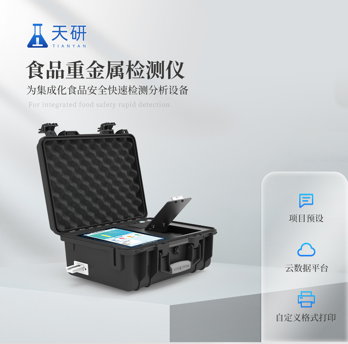 山東天研儀器有限公司生產(chǎn)的食品重金屬檢測(cè)儀為集成化食品安全快速檢測(cè)分析設(shè)備,采用手提箱一體化設(shè)計(jì),重金屬檢測(cè)儀可廣泛應(yīng)用于大米、糧谷、果品、蔬菜、藥材、水產(chǎn)品中重金屬鉛、鎘、六價(jià)鉻、汞、砷、鐵、鎳、鋁的快速檢測(cè),檢測(cè)項(xiàng)目可根據(jù)日后需求可進(jìn)行遠(yuǎn)程升級(jí)。