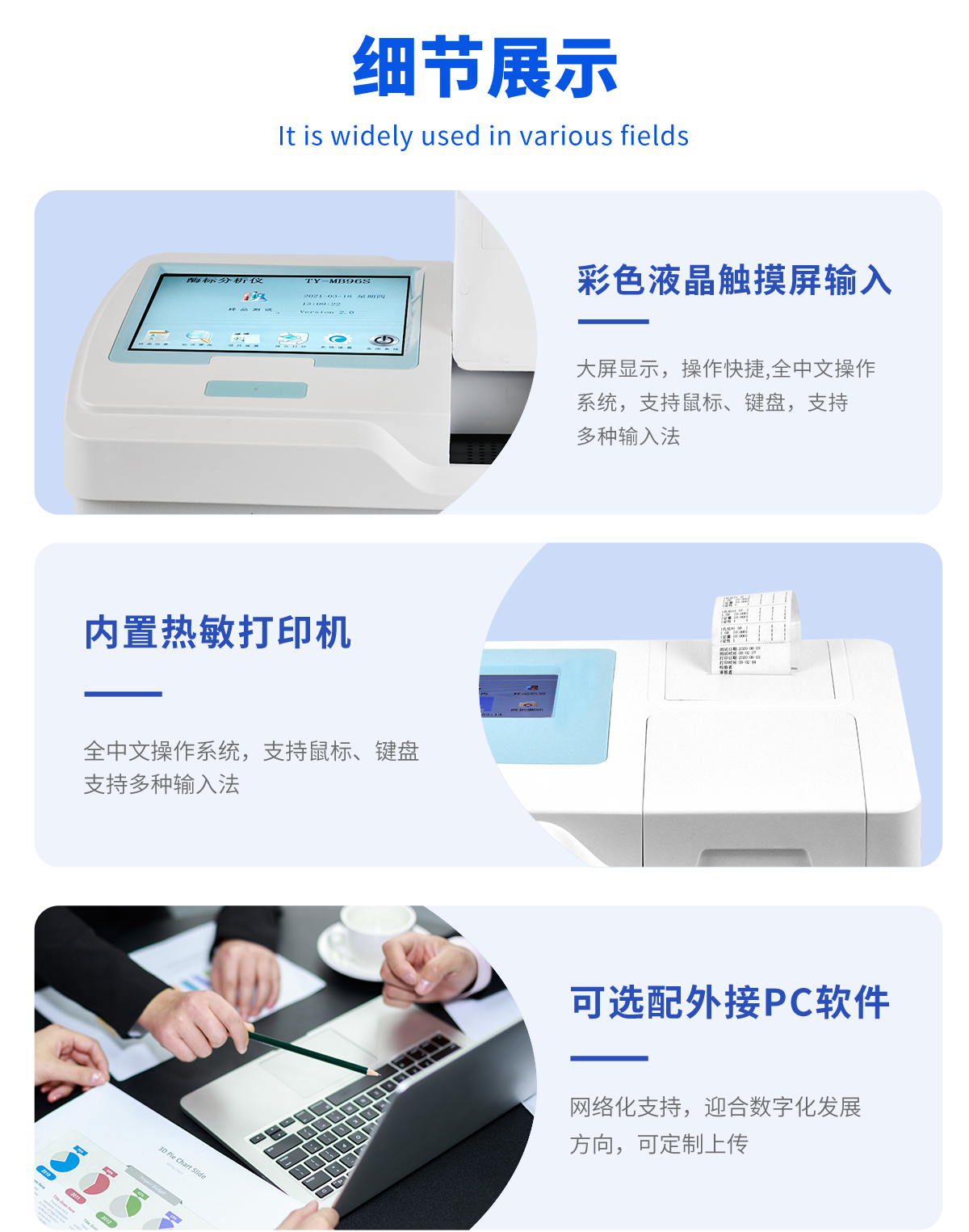| 10.4英寸彩色液晶觸摸屏輸入,大屏顯示,操作快捷; | 全屏顯示96孔可視化布板操作界面; | 自動儲存標準曲線,用戶可對標準曲線進行修正; | 內置嵌入式系統,無需外接電腦即可操作、存儲、打印; | 單波長和雙波長測試模式下均可進行自動調零; | 可選配外接PC軟件,網絡化支持,迎合數字化發展方向,可定制上傳; | 海量存在,至少可儲存100萬板(96)測試數據及500個編程項目,并支持數據備份恢復合并; | 在同一板上可進行24個不同項目并可用顯示區分的測試,并可同一板檢測定性和定量項目; | 模板功能,固定檢測工作,極大簡化操作人員工作量; | 智能計算測試結果,確保測試結果的準確有效,并可自動報警; | 全新Windows彩色圖形化界面,全中文操作系統,支持鼠標、鍵盤,支持多種輸入法; | 光源智能開關,延長其壽命; | 全面完善的質控功能,包含westguard多規則質控,即刻法質控等多種質控圖及質控參數計算,具有質控報警功能; | 提供多種打印方式及多種形式中文報告,并可定制各式報告; | 布板和保存導入功能,大幅提高常用項目的測試效率; | 可選擇吸光度、Cut-Off定性計算、單點定標、折線回歸、線性回歸、指數回歸、對數回歸、雙對數回歸、log-logit、冪回歸、四參數回歸、酶抑制率等計算方法; | 專用系統維護菜單,自動判斷儀器當前狀態及性能指標,并可打印相關數據; |