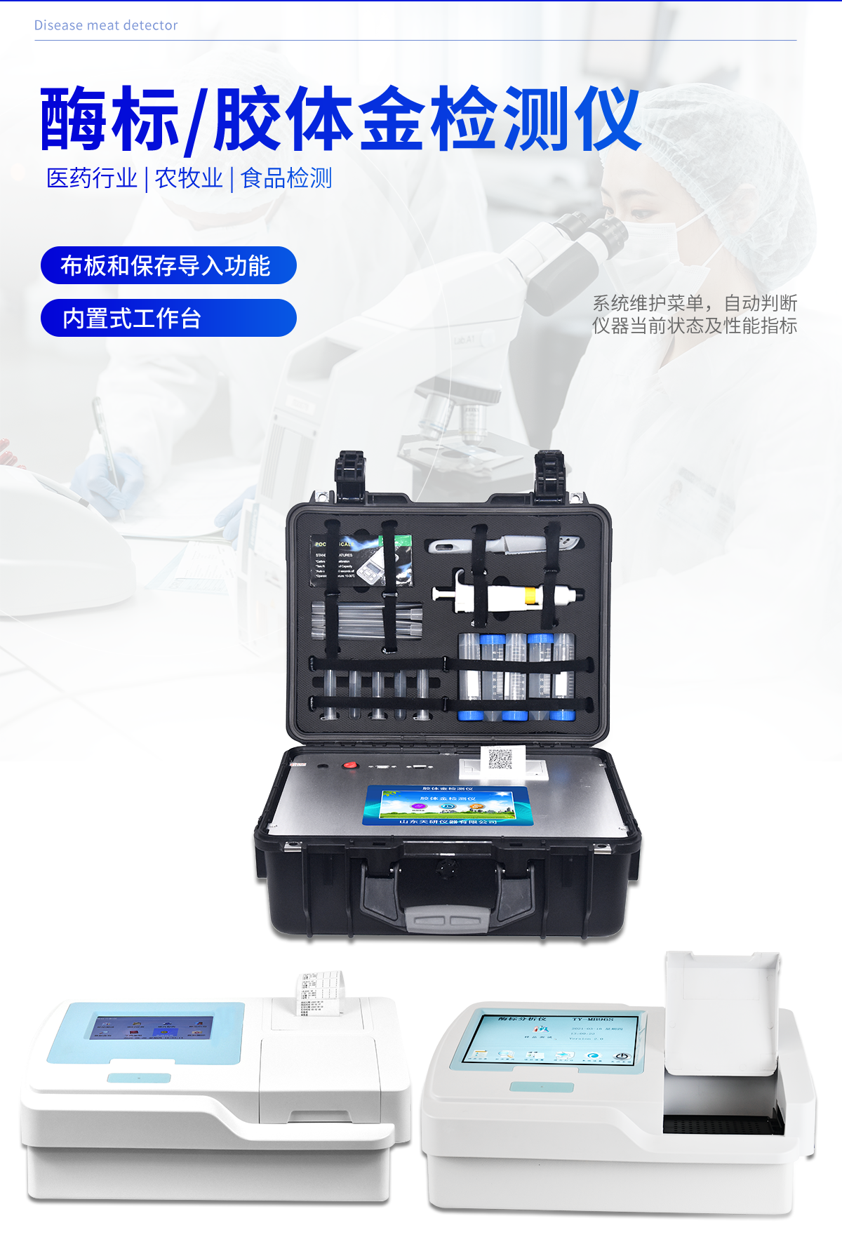 產品詳情:產品用途: 該膠體金檢測儀適用于豬、雞、鴨、羊、牛、牛奶等畜禽肉產品中獸藥殘留,包括抗生素類殘留、瘦肉精激素類殘留和水產品有毒有害物質的現場快速篩查定及性定量檢測。 該多功能獸藥殘留檢測儀為集成化肉品安全快速檢測分析設備,可廣泛應用于畜牧養殖場、屠宰場、食品肉產品深加工企業、食藥監局