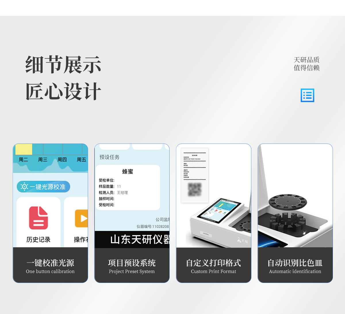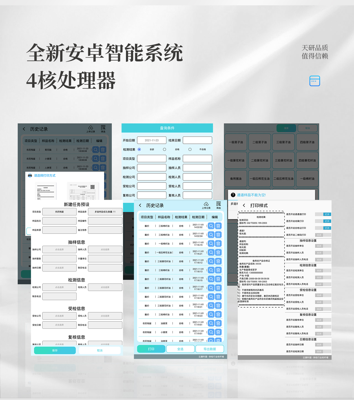| 儀器采用臺式一體化系統檢測技術,將分光光度模塊、數字化管理模塊、無線通訊模塊高度集成于一體,支持檢測200種食品安全檢測項目,同時預留升級檢測方法。 | 儀器檢測模塊標準化、智能化,檢測項目可隨意自由組合。檢測箱體內置多個標準檢測單元,檢測模塊可以調整配置。 | 顯示屏幕:儀器采用10.1英寸豎向液晶觸摸屏顯,搭配運行安卓智能操作系統,主控芯片采用ARM Cortex-A7,RK3288/4核處理器,主頻1.88Ghz,操作方便,性能更強。 | 檢測通道:≥12通道;采用精密旋轉比色池設計,使用同芯片同光源校準精度,解決不同光源之間的誤差值,更加準確**。(1-12通道間誤差0.1%,**號:ZL202022821055.2) | 儀器光源:高精度進口四波長冷光源,每個通道均配置 410、520、590、630nm 波長光源,標配**的光路切換裝置,**光路切換功能可實現64波長,并且所有檢測項目可實現所有通道同時檢測。 | 設備可一鍵校準,自動保存校準數據,自動對比校驗,得到精準光源,采用Android SP存儲數據,光源數據永不丟失,方便每一次使用。 | 通訊接口:配備無線通信模塊、可選配4G(APN)通訊模塊和藍牙傳輸,同時具有雙USB接口以及RJ45網線接口,可以多方式實現數據保存及數據傳輸。 | 存儲方式:支持U盤存儲,標準USB接口,免驅動安裝。檢測結果存儲容量20萬條以上,可生成Excel表格進行拷貝,并具有登錄保護功能。 | 智能化操作系統: | 1)操作系統:儀器可在同一檢測界面自動對應相關檢測通道,一次性選擇1-12個樣品名稱,無需退出界面,節省操作時間。并可以對每個通道屬性和樣品信息單獨進行編輯,例如送檢單位、人員,檢測人員等,打印時勾選打印顯示。 | 2)數據集成系統:設備首頁自動匯總分析檢測數據,包含:周檢測數據、月檢測數據,全部檢測總數量,均包含檢測總數,合格數,不合格數,以及相關柱形分析圖,各項檢測數據一目了然,無需電腦查詢,更加快捷直觀。 | 3)數據庫系統:十幾項數據庫分類管理儀器:包含項目類型、項目數據、檢測數據、歷史記錄、國標信息、曲線信息、采樣信息、檢測信息、受檢信息、復核信息、圖表信息、光源校準信息、打印樣式信息、樣品庫信息等等,數據庫之間互相協調聯動保證數據的真實完整性。同時產品數據庫以及歷史檢測記錄支持一鍵檢索功能。 | 4)限量規判系統:具有限量查詢、添加物質合規判定系統。檢測出結果后,系統自動調用系統數據庫中相關國標進行比對判定,客觀顯示判定結果是否合格。 | 5)項目預設系統:儀器具有任務預設模塊,一鍵提前預設,給出方便快捷的新檢測方案,每一個任務分別可以設置不同的樣品、批次、編號、來源、備注、抽樣信息、檢測信息、受檢信息、復核信息等更多信息。樣品送檢時一鍵調取保存信息,并可多次調取,大大提高檢測效率。 | 6)數據監管系統:同步對接監管平臺,數據可局域網和互聯網數據上傳,檢測結果可選擇直接傳至食品安全監管平臺。進行區域食品安全監管及大數據分析處理與數據統計,檢測區域食品安全長短期動態,達到食品安全問題預估、預警。 | 7)打印系統:內置全新打印機,新創自定義打印方式,可按需靈活勾選控制:產品合格證(國家農業部標準要求),二維碼,抽樣信息、檢測信息,受檢信息、復核信息、抽樣日期、檢測日期等信息的打印。 | 供電模式:儀器交直流兩用,直流12V供電,可連接車載電源,可配6ah大容量充電鋰電池,電量可實時顯示,方便戶外流動測試。 | 儀器加入遠程升級功能,可定向分客戶分儀器更新,開機后自動更新,客戶無需任何操作,即可升級全新項目。做到了無需退換機器即可實現實時遠程升級檢測儀器。 | 設備尺寸:(長*寬*高)440*300*180mm | 儀器加入遠程升級功能,可定向分客戶分儀器更新,開機后自動更新,客戶無需任何操作,即可升級全新項目。做到了無需退換機器即可實現實時遠程升級檢測儀器。 |