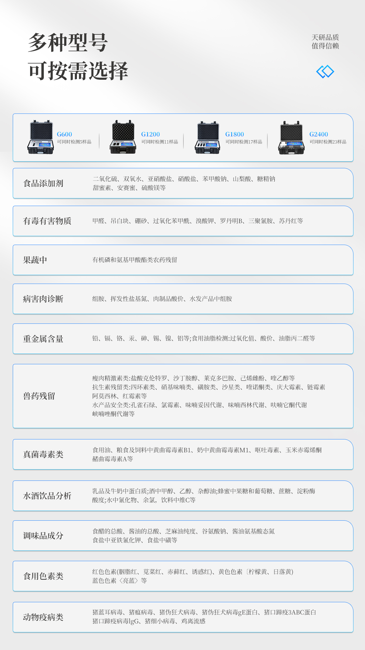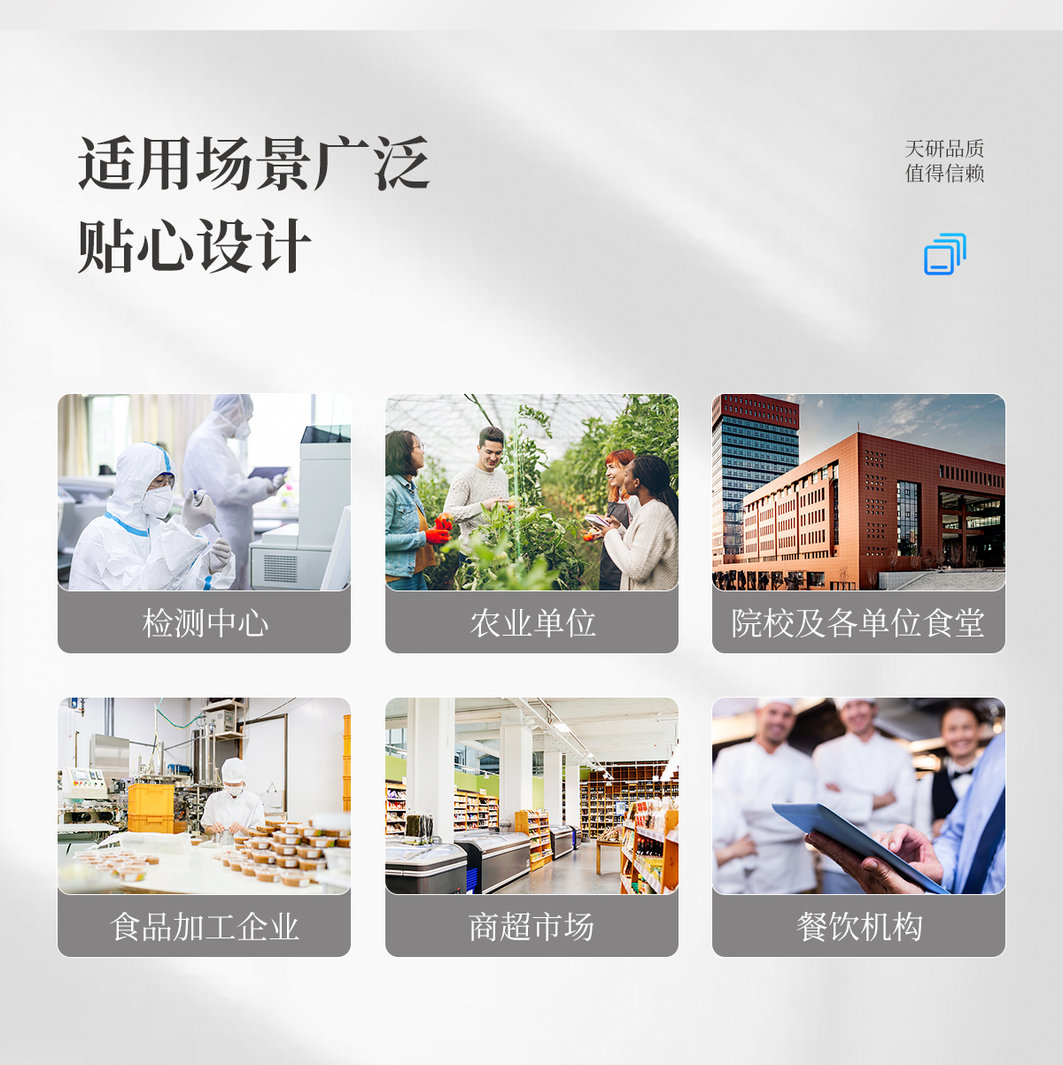 食品添加劑:二氧化硫、雙氧水、亞硝酸鹽、硝酸鹽、苯甲酸鈉、山梨酸、糖精鈉、甜蜜素、安賽蜜、硫酸鎂等有毒有害物質:甲醛、吊白塊、硼砂、過氧化苯甲酰、溴酸鉀、羅丹明B、三聚氰胺、蘇丹紅等果蔬中:有機磷和氨基甲酸酯類農藥殘留;病害肉診斷:組胺、揮發性鹽基氮、肉制品酸價、水發產品中組胺重金屬含量:鉛、鎘、鉻、汞、砷、錫、鎳、鋁等;食用油脂檢測:過氧化值、酸價、油脂丙二醛等。瘦肉精激素類(獸藥):鹽酸克倫特羅、沙丁胺醇、萊克多巴胺、己烯雌酚、喹乙醇等抗生素殘留類(獸藥):四環素類、硝基呋喃類、磺胺類、沙星類、喹諾酮類、慶大霉素、鏈霉素、阿莫西林、紅霉素等水產品安全類:孔雀石綠、氯霉素、呋喃妥因代謝、呋喃西林代謝、呋喃它酮代謝、呋喃唑酮代謝等真菌毒素類:食用油、糧食及飼料中黃曲霉毒素B1、奶中黃曲霉毒素M1、嘔吐毒素、玉米赤霉烯酮、赭曲霉毒素A等水酒飲品分析:乳品及牛奶中蛋白質;酒中甲醇、乙醇、雜醇油;蜂蜜中果糖和葡萄糖、蔗糖、淀粉酶、酸度;水中氰化物、余氯,飲料中維C等調味品成分:食醋的總酸、醬油的總酸、芝麻油純度、谷氨酸鈉、醬油氨基酸態氮、食鹽中亞鐵氰化鉀、食鹽中碘等食用色素類:紅色色素(胭脂紅、莧菜紅、赤蘚紅、誘惑紅)、黃色色素(檸檬黃、日落黃)、藍色色素(亮藍)等動物疫病類:豬藍耳病毒、豬瘟病毒、豬偽狂犬病毒、豬偽狂犬病毒gE蛋白、豬口蹄疫3ABC蛋白、豬口蹄疫病毒IgG、豬細小病毒、雞禽流感等