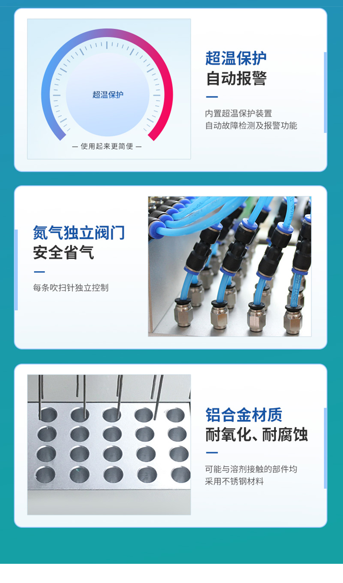 | 分配室上各氣針通道可組合使用或單獨使用,每一路氣針均可單獨開關。分配室的高度可視需要調節。 | 每一路氣體流量可單獨進行調節,克服了不可調氮吹儀各氣路氣流量大小不一的弱點。 | 數字溫控器,雙數字顯示. | 可能與溶劑接觸的部件均采用不銹鋼材料、合金鋁并表面進行塑料噴涂,使用壽命長且清潔方便。 | 整機可放入通風櫥中使用。 | 一般標配的加熱塊規格為孔徑∮16mm。 |