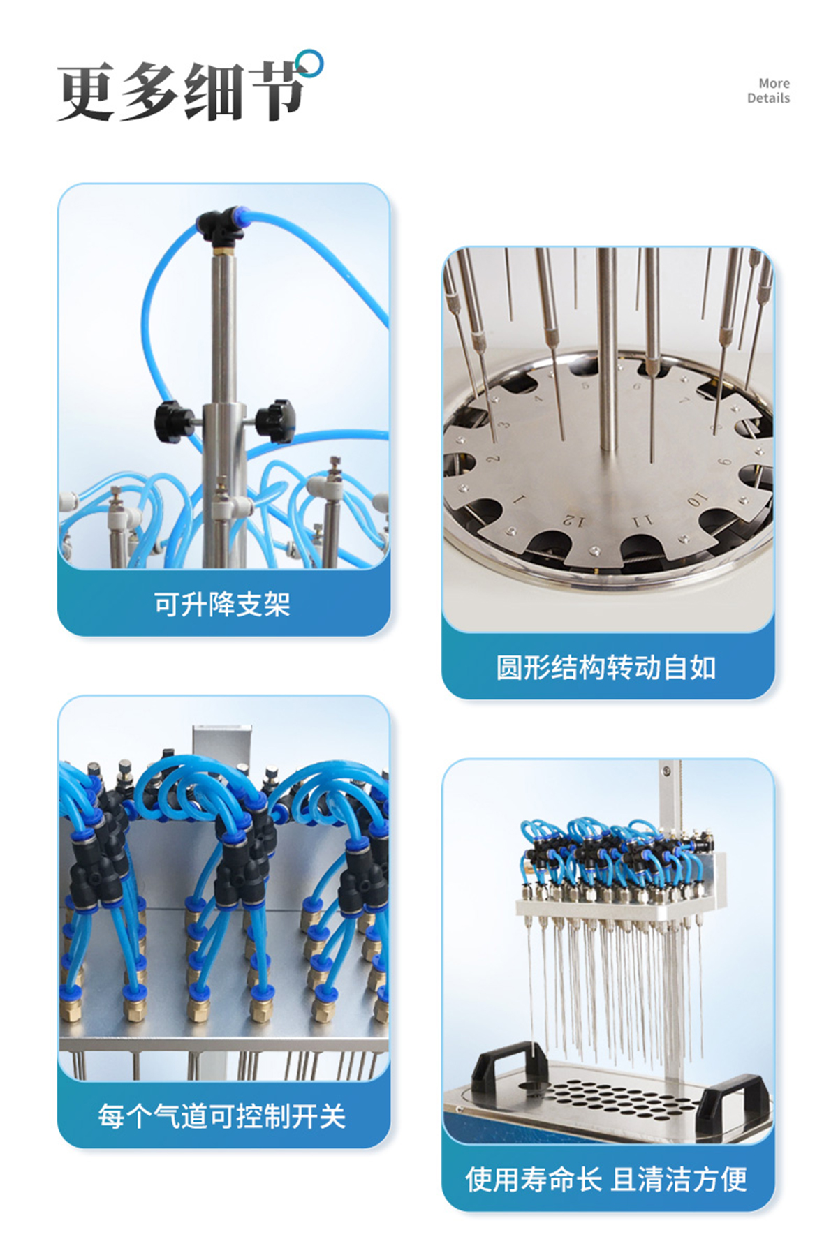| 圓形水浴氮吹儀適用于試管、錐形瓶、離心管等不同規格的容器。 | 樣品位數:12位/24位,彈簧試管夾的樣品架固定定位,每個樣品都有數字編號。 | 試管通過帶彈簧的試管夾和支撐盤來固定位置,可任意調節高度方向。 | 自由升降的針型閥管,根據試管大小和溶劑多少,各導氣管可獨立升降至合適的高度,同時可調的針型閥能管控制氣體流量。 | 圓形結構,轉動自如,方便樣品支架進出水浴,操作方便。 | 智能數字溫控器,可定時,雙數字顯示,調節采用PID技術并可實現超溫報警及防干燒。 | 圓形氮吹儀的所有部件均勻不銹鋼制造,可耐酸堿等有機溶劑。 | 調節閥:保證良好的氣密性,經久耐用。 | 在濃縮有毒溶劑時,整個系統可置于通風柜中。 |