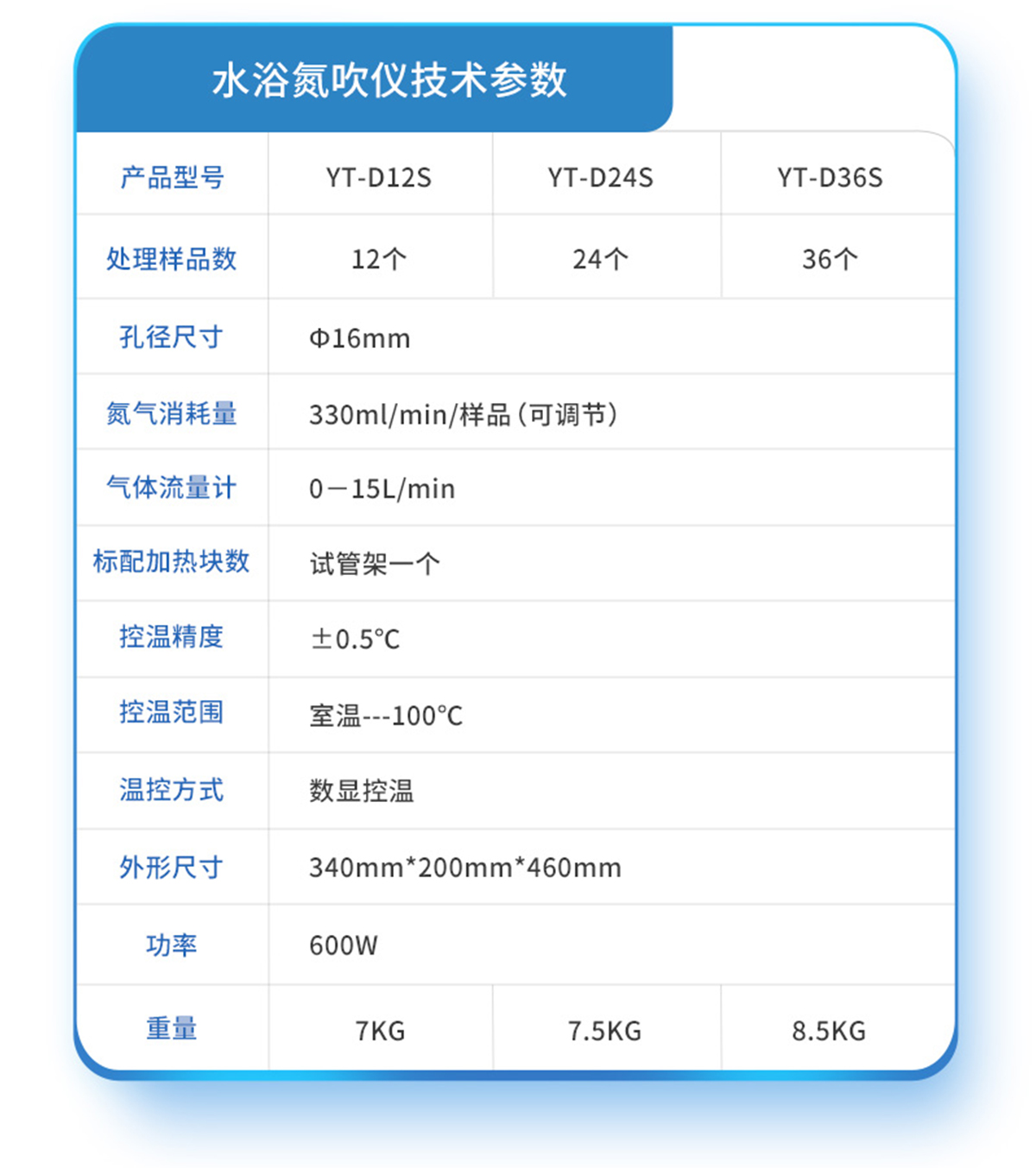| YT-D12SY | 12個獨立控制 | 圓形水浴 | 10~29mm | 0--150mm | 360°C | ±0.5℃ | 室溫---100℃ | 4位數顯/PID調節/超溫報警 | 0~99h59min | 可控 0-15L/min | 330ml/min/樣品 | 1000W | 10KG |