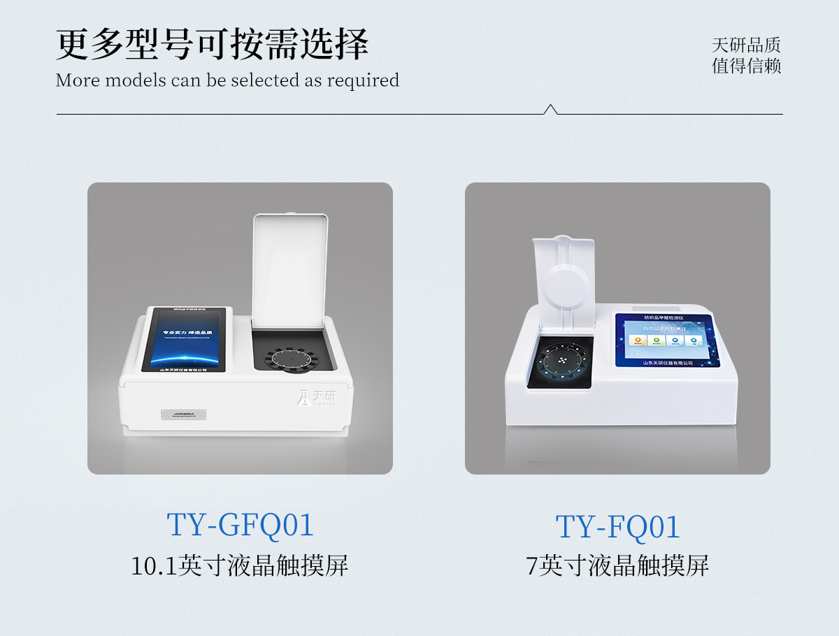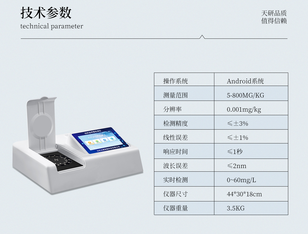 | 1、智能**且方便 | ①智能芯片:主控芯片采用ARM Cortex-A7,RK3288/4核處理器,搭配安卓智能操作系統(tǒng),集實(shí)驗(yàn)操作,分析結(jié)果,打印報(bào)告等功能于一體,使用方便,性能更強(qiáng)。 | ②大屏顯示:采用10.1英寸液晶觸摸屏,單機(jī)即可操作,無(wú)需連接外部顯示或控制器。 | ③多樣同檢:儀器具有12個(gè)檢測(cè)通道,可同時(shí)一次性檢測(cè)11個(gè)樣品,效率更高。 | ④工作預(yù)設(shè):具有任務(wù)預(yù)設(shè)模塊,一鍵提前預(yù)設(shè)樣品所有信息內(nèi)容。來(lái)樣時(shí)可直接檢測(cè),同時(shí)可多次調(diào)取。 | ⑤數(shù)據(jù)分析:設(shè)備首頁(yè)自動(dòng)匯總分析數(shù)據(jù),并繪制柱形分析圖,各項(xiàng)檢測(cè)數(shù)據(jù)一目了然,快捷直觀。 | ⑥高度集成:模塊高度集合,將分光光度模塊、數(shù)字化管理模塊、無(wú)線通訊模塊集成于一體。可將檢測(cè)結(jié)果進(jìn)行分析,直接上傳至數(shù)據(jù)平臺(tái),實(shí)現(xiàn)數(shù)據(jù)共享,方便后期進(jìn)行數(shù)據(jù)分析與統(tǒng)計(jì)。 | ⑦遠(yuǎn)程升級(jí):儀器具備遠(yuǎn)程升級(jí)功能,可遠(yuǎn)程升級(jí)程序,無(wú)需返廠,并可持續(xù)性免費(fèi)更新系統(tǒng)版本,降低成本及運(yùn)輸損耗風(fēng)險(xiǎn)。 | 2、檢測(cè)精準(zhǔn)且直觀 | ①**技術(shù):精密旋轉(zhuǎn)比色池,使用同芯片同光源校準(zhǔn)精度,解決不同光源之間存在波長(zhǎng)誤差的問(wèn)題,更加準(zhǔn)確**。 | ②結(jié)果直觀:儀器自動(dòng)對(duì)檢測(cè)結(jié)果與國(guó)標(biāo)限量值進(jìn)行對(duì)比,自動(dòng)判定結(jié)果是否合格,結(jié)果更直觀。 | 3、功能強(qiáng)大且實(shí)用 | ①存儲(chǔ)功能:設(shè)備可以存儲(chǔ)數(shù)據(jù)100000組,可在屏幕上直觀查看歷史數(shù)據(jù),可導(dǎo)出數(shù)據(jù)。 | ②打印功能:設(shè)備自帶打印功能,可對(duì)樣品信息及檢測(cè)結(jié)果無(wú)限次隨意打印。 | ③全新方式:新創(chuàng)自定義打印方式,可按需靈活勾選控制:二維碼,抽樣信息、檢測(cè)信息,受檢信息、復(fù)核信息、抽樣日期、檢測(cè)日期等信息的打印 | ④多重編輯:樣品信息可多重編輯,可以對(duì)每個(gè)通道屬性和樣品信息單獨(dú)進(jìn)行編輯,例如樣品信息、抽樣信息、檢測(cè)信息,受檢信息、復(fù)核信息、抽樣日期、檢測(cè)日期等信息等。 | ⑤雙語(yǔ)設(shè)計(jì):全中文/英文操作菜單,簡(jiǎn)單實(shí)用,適用于不同用戶的需求。 |