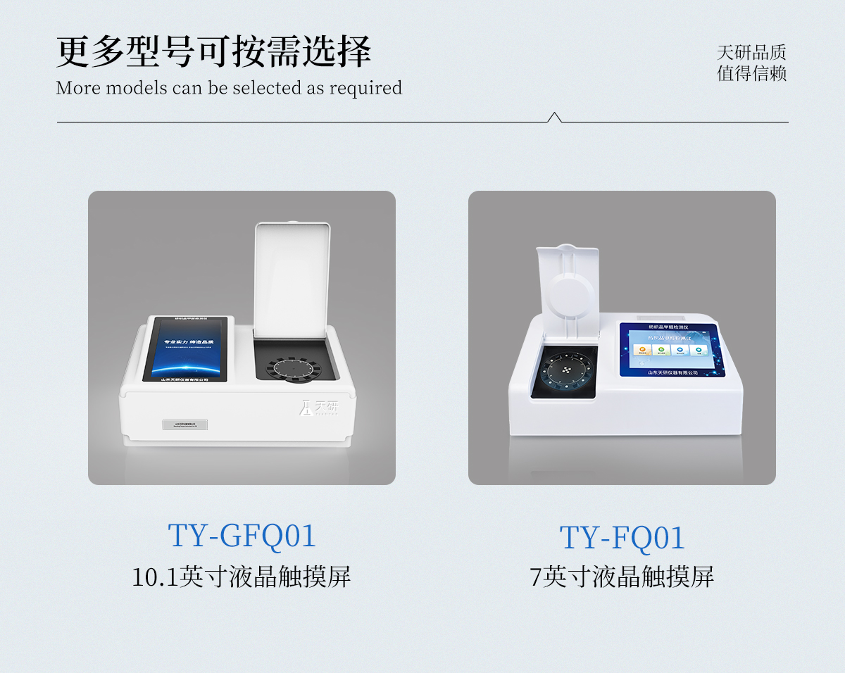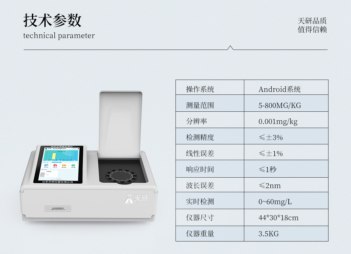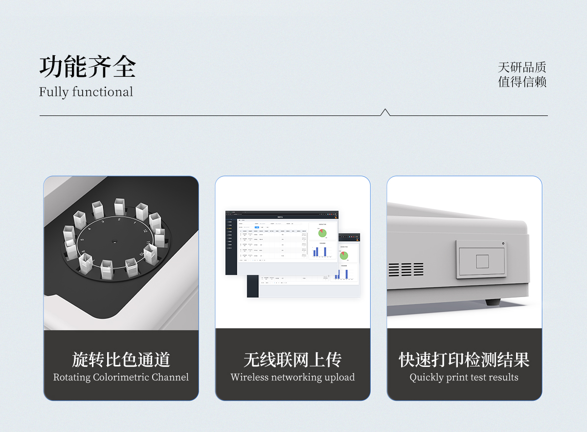 | 1、智能**且方便 | ①智能芯片:主控芯片采用ARM Cortex-A7,RK3288/4核處理器,搭配安卓智能操作系統(tǒng),集實驗操作,分析結(jié)果,打印報告等功能于一體,使用方便,性能更強(qiáng)。 | ②大屏顯示:采用10.1英寸液晶觸摸屏,單機(jī)即可操作,無需連接外部顯示或控制器。 | ③多樣同檢:儀器具有12個檢測通道,可同時一次性檢測11個樣品,效率更高。 | ④工作預(yù)設(shè):具有任務(wù)預(yù)設(shè)模塊,一鍵提前預(yù)設(shè)樣品所有信息內(nèi)容。來樣時可直接檢測,同時可多次調(diào)取。 | ⑤數(shù)據(jù)分析:設(shè)備首頁自動匯總分析數(shù)據(jù),并繪制柱形分析圖,各項檢測數(shù)據(jù)一目了然,快捷直觀。 | ⑥高度集成:模塊高度集合,將分光光度模塊、數(shù)字化管理模塊、無線通訊模塊集成于一體。可將檢測結(jié)果進(jìn)行分析,直接上傳至數(shù)據(jù)平臺,實現(xiàn)數(shù)據(jù)共享,方便后期進(jìn)行數(shù)據(jù)分析與統(tǒng)計。 | ⑦遠(yuǎn)程升級:儀器具備遠(yuǎn)程升級功能,可遠(yuǎn)程升級程序,無需返廠,并可持續(xù)性免費(fèi)更新系統(tǒng)版本,降低成本及運(yùn)輸損耗風(fēng)險。 | 2、檢測精準(zhǔn)且直觀 | ①**技術(shù):精密旋轉(zhuǎn)比色池,使用同芯片同光源校準(zhǔn)精度,解決不同光源之間存在波長誤差的問題,更加準(zhǔn)確**。 | ②結(jié)果直觀:儀器自動對檢測結(jié)果與國標(biāo)限量值進(jìn)行對比,自動判定結(jié)果是否合格,結(jié)果更直觀。 | 3、功能強(qiáng)大且實用 | ①存儲功能:設(shè)備可以存儲數(shù)據(jù)100000組,可在屏幕上直觀查看歷史數(shù)據(jù),可導(dǎo)出數(shù)據(jù)。 | ②打印功能:設(shè)備自帶打印功能,可對樣品信息及檢測結(jié)果無限次隨意打印。 | ③全新方式:新創(chuàng)自定義打印方式,可按需靈活勾選控制:二維碼,抽樣信息、檢測信息,受檢信息、復(fù)核信息、抽樣日期、檢測日期等信息的打印 | ④多重編輯:樣品信息可多重編輯,可以對每個通道屬性和樣品信息單獨進(jìn)行編輯,例如樣品信息、抽樣信息、檢測信息,受檢信息、復(fù)核信息、抽樣日期、檢測日期等信息等。 | ⑤雙語設(shè)計:全中文/英文操作菜單,簡單實用,適用于不同用戶的需求。 |