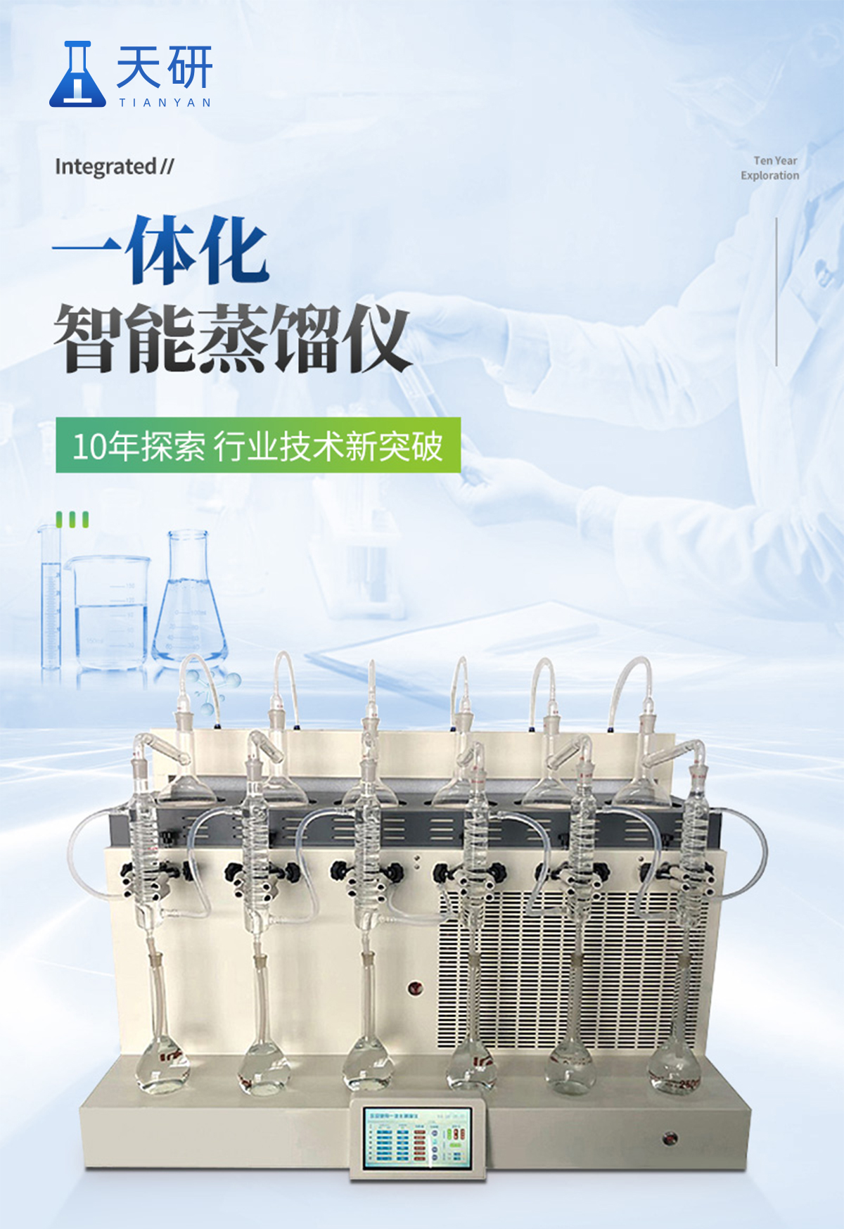 TY-ZL6智能一體化蒸餾儀是根據實驗室蒸餾預處理操作規程,集恒溫加熱、蒸餾終點自動控制、冷卻水循環于一體的新型智能蒸餾處理裝置。
