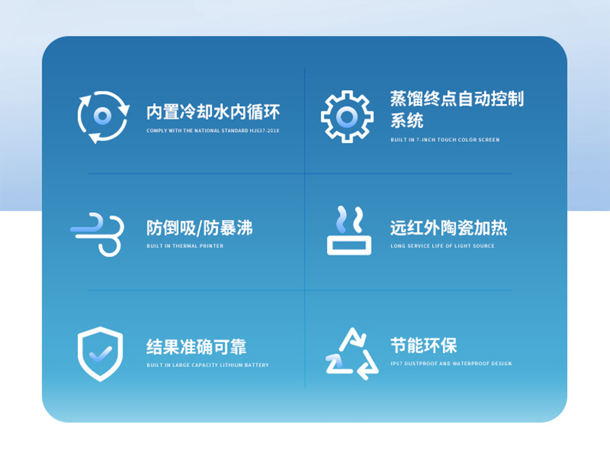 該儀器實驗了控溫、自動防倒吸、加熱均勻、防止暴沸、智能終點控制等功能。使用方便,節能環保。經過實驗室蒸餾回收率比對驗證,結果準確,回收率達95%以上。該儀器可廣泛適用于環保、疾控、水產、供排水、高校、科研院所、廠礦企業等各類化學實驗室需要蒸餾處理的場所,如揮發酚、氨氮、凱氏氮油中水分等項目的蒸餾處理。