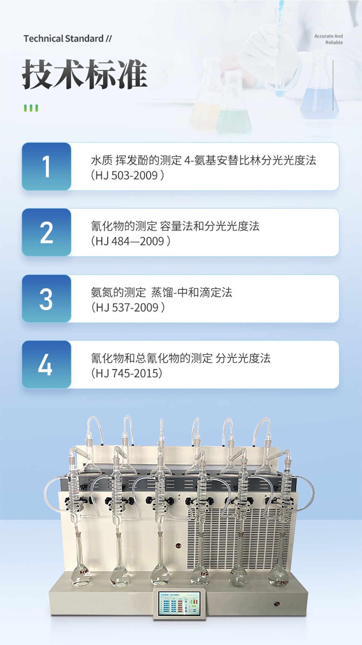| 食品中二氧化硫殘留量、酒精度的蒸餾前處理項目 | 1.水質 揮發酚的測定 4-氨基安替比林分光光度法(HJ 503-2009 ) | 2.水質 青化物的測定 容量法和分光光度法(HJ 484—2009 ) | 3.水質 氨氮的測定 蒸餾-中和滴定法(HJ 537-2009 ) | 4.土壤 青化物和總青化物的測定 分光光度法(HJ 745-2015) |