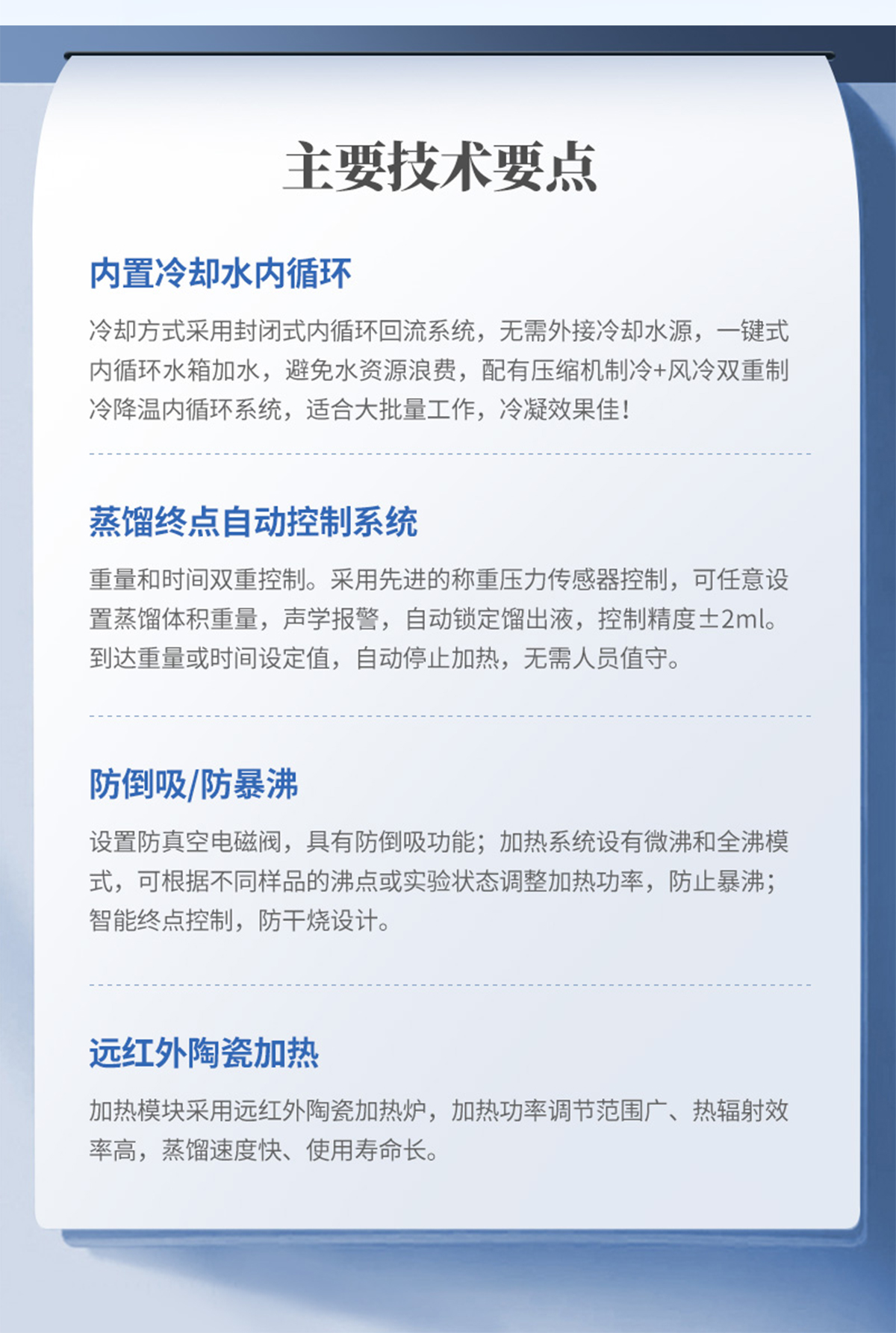 | 1、加熱方式:采用遠紅外陶瓷加熱爐,紅外線輻射加熱(無明火加熱、防水); | 2、加熱單元:6個,可單孔單控制; | 3、升溫時間:5-8min; | 4、蒸餾速度:2-12ml/min; | 5、蒸餾終點控制:自動偵測蒸餾終點功能,采用稱重和時間雙重控制,蒸餾體積控制在±2ml之內,自動化程度高; | 6、單爐加熱功率:0-450W(單孔可調); | 7、加熱功率:0-2700W(可調); | 8、冷卻方式:封閉式內循環回流系統,也可外接冷卻水源; | 9、防倒吸:設有防真空電磁閥,具有防倒吸功能; | 10、時間控制:0-200min可調; | 11、蒸餾瓶規格:500mlX6,250 X6 更多規格可選; | 12、額定電壓/頻率:220V/50HZ; |