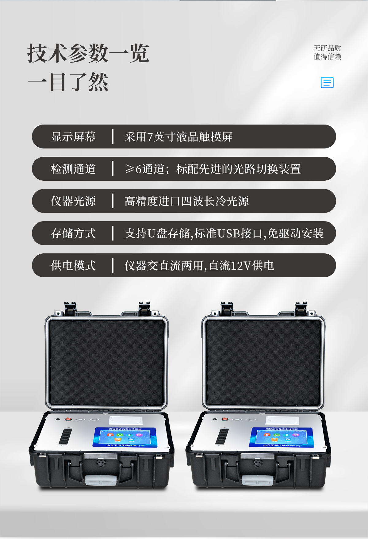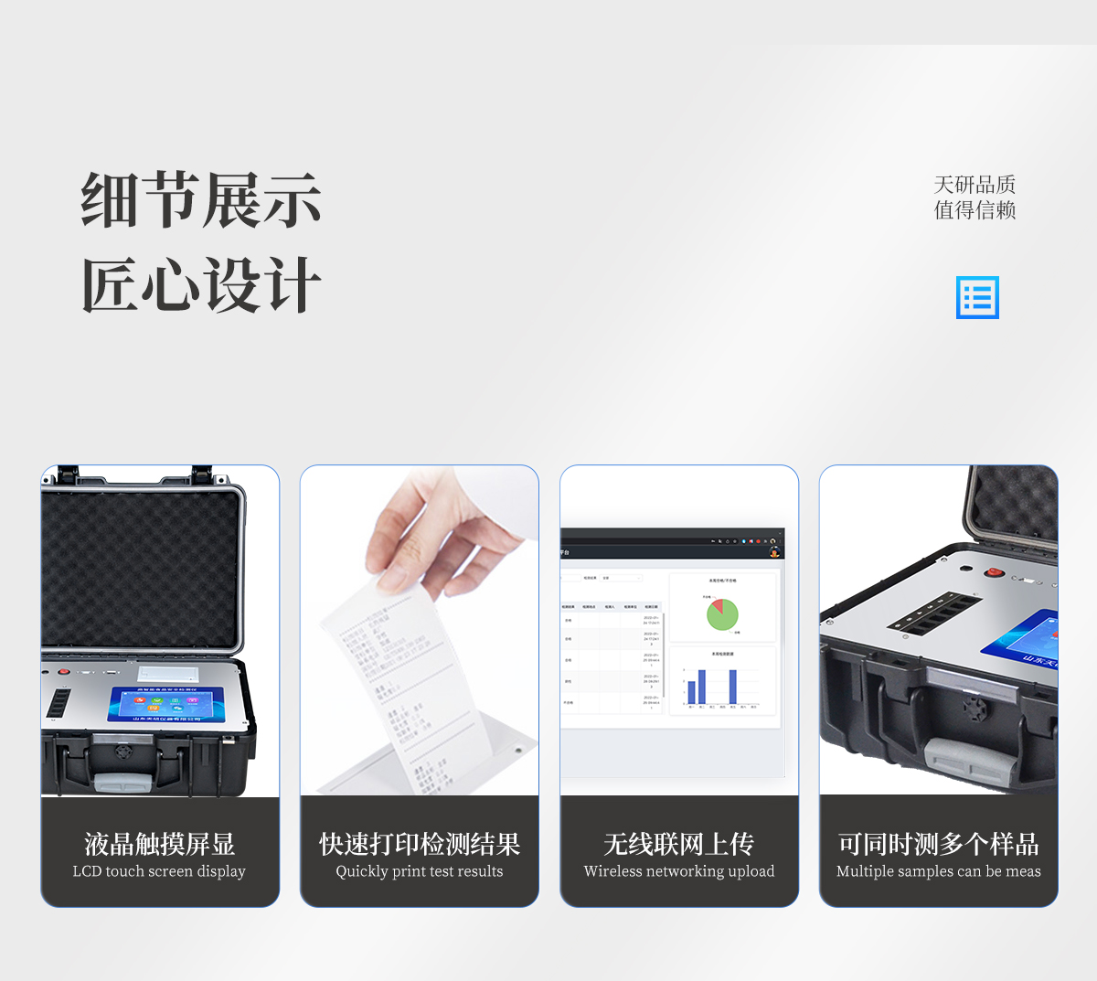| 儀器采用手提式一體化系統(tǒng)檢測(cè)技術(shù),將分光光度模塊、新型農(nóng)殘檢測(cè)模塊、數(shù)字化管理模塊、無(wú)線通訊模塊高度集成于一體,支持檢測(cè)200種食品安全檢測(cè)項(xiàng)目,同時(shí)預(yù)留升級(jí)檢測(cè)方法。 | 儀器檢測(cè)模塊標(biāo)準(zhǔn)化、智能化,檢測(cè)項(xiàng)目可隨意自由組合。檢測(cè)箱體內(nèi)置多個(gè)標(biāo)準(zhǔn)檢測(cè)單元,檢測(cè)模塊可以調(diào)整配置。 | 顯示屏幕:儀器采用10.1英寸豎向液晶觸摸屏顯,搭配運(yùn)行安卓智能操作系統(tǒng),主控芯片采用ARM Cortex-A7,RK3288/4核處理器,主頻1.88Ghz,操作方便,性能更強(qiáng)。 | 檢測(cè)通道:≥12通道;采用精密旋轉(zhuǎn)比色池設(shè)計(jì),使用同芯片同光源校準(zhǔn)精度,解決不同光源之間的誤差值,更加準(zhǔn)確**。(1-12通道間誤差0.1%,**號(hào):ZL202022821055.2) | 儀器光源:高精度進(jìn)口四波長(zhǎng)冷光源,每個(gè)通道均配置 410、520、590、630nm 波長(zhǎng)光源,標(biāo)配**的光路切換裝置,**光路切換功能可實(shí)現(xiàn)64波長(zhǎng),并且所有檢測(cè)項(xiàng)目可實(shí)現(xiàn)所有通道同時(shí)檢測(cè)。 | 設(shè)備可一鍵校準(zhǔn),自動(dòng)保存校準(zhǔn)數(shù)據(jù),自動(dòng)對(duì)比校驗(yàn),得到精準(zhǔn)光源,采用Android SP存儲(chǔ)數(shù)據(jù),光源數(shù)據(jù)永不丟失,方便每一次使用。 | 通訊接口:配備無(wú)線通信模塊、4G(APN)通訊模塊、藍(lán)牙傳輸,同時(shí)具有雙USB接口以及RJ45網(wǎng)線接口,可以多方式實(shí)現(xiàn)數(shù)據(jù)保存及數(shù)據(jù)傳輸 | 存儲(chǔ)方式:支持U盤(pán)存儲(chǔ),標(biāo)準(zhǔn)USB接口,免驅(qū)動(dòng)安裝。檢測(cè)結(jié)果存儲(chǔ)容量20萬(wàn)條以上,可生成Excel表格進(jìn)行拷貝,并具有登錄保護(hù)功能。 | 智能化操作系統(tǒng): | 1)操作系統(tǒng):儀器可在同一檢測(cè)界面自動(dòng)對(duì)應(yīng)相關(guān)檢測(cè)通道,一次性選擇1-12個(gè)樣品名稱(chēng),無(wú)需退出界面,節(jié)省操作時(shí)間。并可以對(duì)每個(gè)通道屬性和樣品信息單獨(dú)進(jìn)行編輯,例如送檢單位、人員,檢測(cè)人員等,打印時(shí)勾選打印顯示。 | 2)數(shù)據(jù)集成系統(tǒng):設(shè)備首頁(yè)自動(dòng)匯總分析檢測(cè)數(shù)據(jù),包含:周檢測(cè)數(shù)據(jù)、月檢測(cè)數(shù)據(jù),全部檢測(cè)總數(shù)量,均包含檢測(cè)總數(shù),合格數(shù),不合格數(shù),以及相關(guān)柱形分析圖,各項(xiàng)檢測(cè)數(shù)據(jù)一目了然,無(wú)需電腦查詢(xún),更加快捷直觀。 | 3)數(shù)據(jù)庫(kù)系統(tǒng):十幾項(xiàng)數(shù)據(jù)庫(kù)分類(lèi)管理儀器:包含項(xiàng)目類(lèi)型、項(xiàng)目數(shù)據(jù)、檢測(cè)數(shù)據(jù)、歷史記錄、國(guó)標(biāo)信息、曲線信息、采樣信息、檢測(cè)信息、受檢信息、復(fù)核信息、圖表信息、光源校準(zhǔn)信息、打印樣式信息、樣品庫(kù)信息等等,數(shù)據(jù)庫(kù)之間互相協(xié)調(diào)聯(lián)動(dòng)保證數(shù)據(jù)的真實(shí)完整性。同時(shí)產(chǎn)品數(shù)據(jù)庫(kù)以及歷史檢測(cè)記錄支持一鍵檢索功能。 | 4)限量規(guī)判系統(tǒng):具有限量查詢(xún)、添加物質(zhì)合規(guī)判定系統(tǒng)。檢測(cè)出結(jié)果后,系統(tǒng)自動(dòng)調(diào)用系統(tǒng)數(shù)據(jù)庫(kù)中相關(guān)國(guó)標(biāo)進(jìn)行比對(duì)判定,客觀顯示判定結(jié)果是否合格。 | 5)項(xiàng)目預(yù)設(shè)系統(tǒng):儀器具有任務(wù)預(yù)設(shè)模塊,一鍵提前預(yù)設(shè),給出方便快捷的新檢測(cè)方案,每一個(gè)任務(wù)分別可以設(shè)置不同的樣品、批次、編號(hào)、來(lái)源、備注、抽樣信息、檢測(cè)信息、受檢信息、復(fù)核信息等更多信息。樣品送檢時(shí)一鍵調(diào)取保存信息,并可多次調(diào)取,大大提高檢測(cè)效率。 | 6)數(shù)據(jù)監(jiān)管系統(tǒng):同步對(duì)接監(jiān)管平臺(tái),數(shù)據(jù)可局域網(wǎng)和互聯(lián)網(wǎng)數(shù)據(jù)上傳,檢測(cè)結(jié)果可選擇直接傳至食品安全監(jiān)管平臺(tái)。進(jìn)行區(qū)域食品安全監(jiān)管及大數(shù)據(jù)分析處理與數(shù)據(jù)統(tǒng)計(jì),檢測(cè)區(qū)域食品安全長(zhǎng)短期動(dòng)態(tài),達(dá)到食品安全問(wèn)題預(yù)估、預(yù)警。 | 7)打印系統(tǒng):內(nèi)置全新打印機(jī),新創(chuàng)自定義打印方式,可按需靈活勾選控制:產(chǎn)品合格證(國(guó)家農(nóng)業(yè)部標(biāo)準(zhǔn)要求),二維碼,抽樣信息、檢測(cè)信息,受檢信息、復(fù)核信息、抽樣日期、檢測(cè)日期等信息的打印。 | 供電模式:儀器交直流兩用,直流12V供電,可連接車(chē)載電源,可配6ah大容量充電鋰電池,電量可實(shí)時(shí)顯示,方便戶(hù)外流動(dòng)測(cè)試。 | 膠體金檢測(cè)模塊:采用雙通道CMOS成像處理技術(shù)及膠體金免疫層析技術(shù),可同時(shí)讀取雙膠體金卡數(shù)據(jù),自動(dòng)采集、處理分析,將檢測(cè)結(jié)果顯示,并可根據(jù)參考限值自動(dòng)判斷檢測(cè)結(jié)果,可檢測(cè)常見(jiàn)的獸藥殘留、生物毒素、抗生素、違禁添加物等。 | 1)探測(cè)技術(shù):CMOS成像探測(cè); | 2)檢測(cè)通道:1個(gè)通道; | 3)檢測(cè)方式:消線法和比