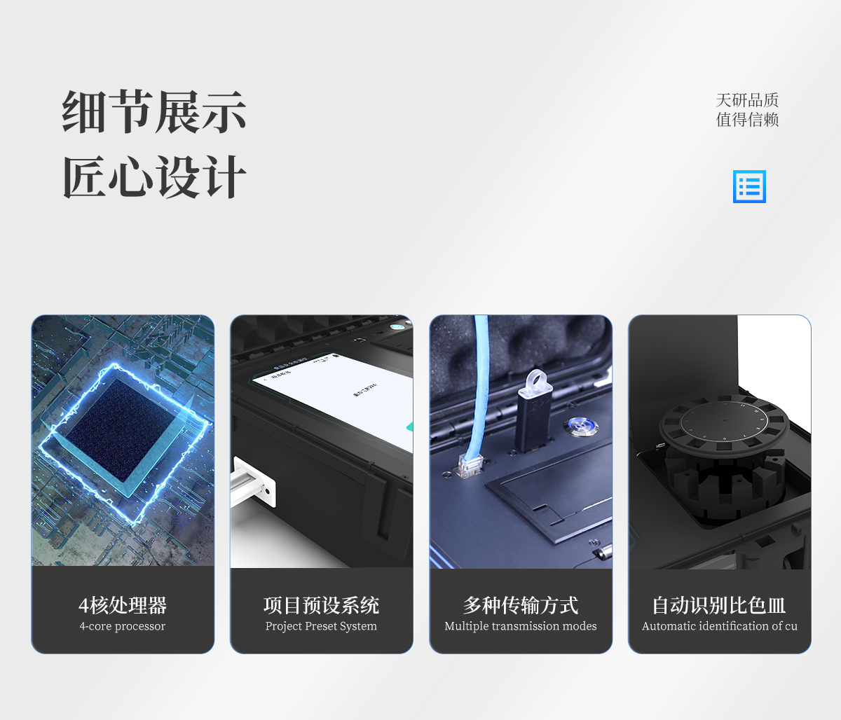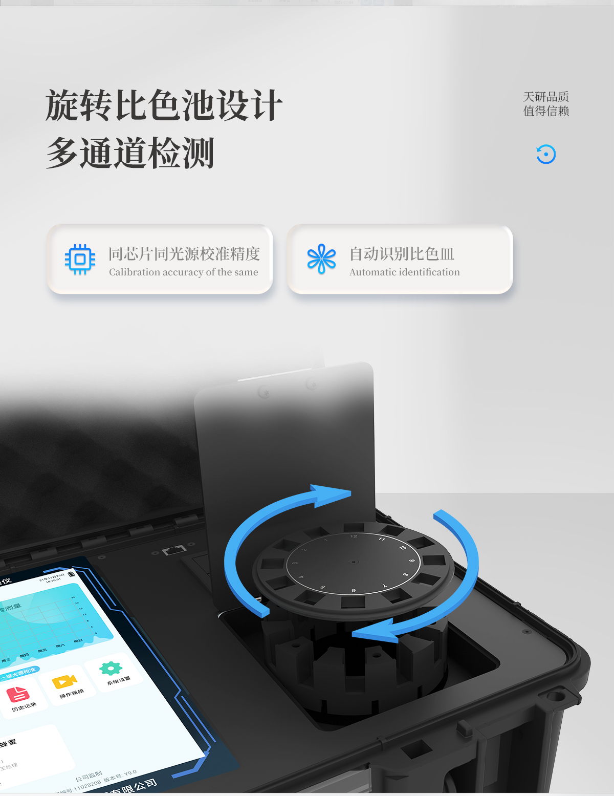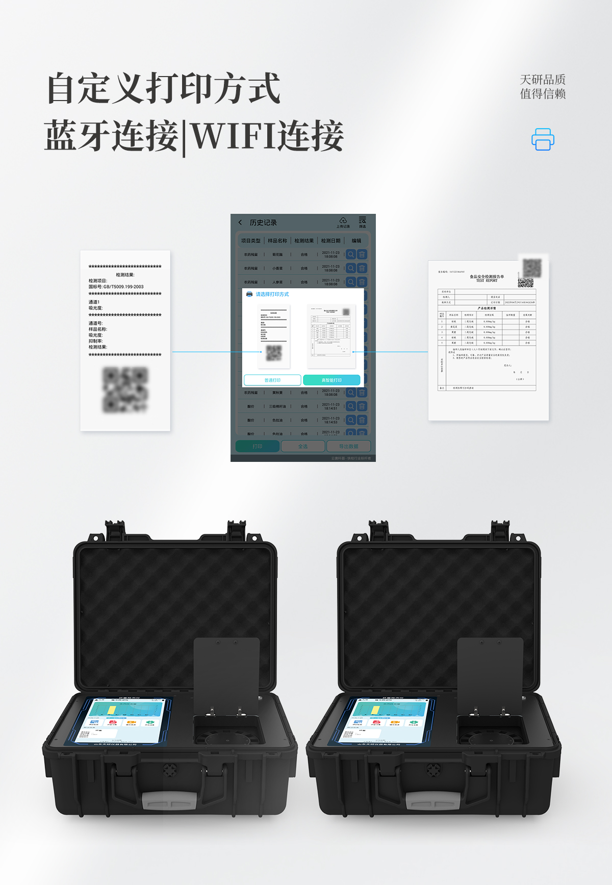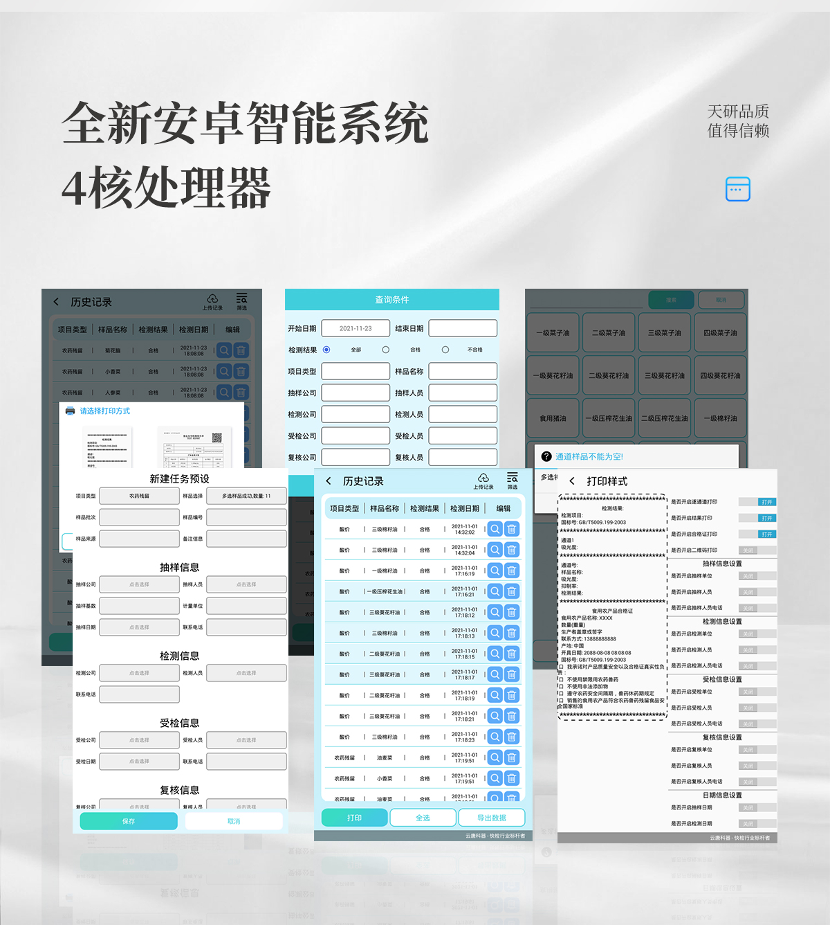 | 儀器采用手提式一體化系統檢測技術,將分光光度模塊、膠體金檢測模塊、新型農殘檢測模塊、數字化管理模塊、無線通訊模塊高度集成于一體,支持檢測200種食品安全檢測項目,同時預留升級檢測方法。 | 儀器檢測模塊標準化、智能化,可隨意自由組合。檢測箱體內置多個標準檢測單元,檢測模塊可以調整配置。 | 儀器采用全新安卓智能系統,主控芯片采用 ARM Cortex-A7,RK3288/4核處理器,10.1寸高清液晶觸摸豎屏,更加**的UI交互界面,運轉快捷;儀器配備無線通信模塊: 4G(APN)通訊模塊、Wifi模塊,藍牙傳輸,同時具有雙USB接口以及RJ45接口能以多種方式實現數據保存和數據傳輸功能。 | 創新檢測模式:★檢測通道:≥12通道;采用精密旋轉比色池設計,使用同芯片同光源校準精度,解決不同光源之間的誤差值。1-12通道間誤差0.1%。(**號:ZL202022821055.2) | ★儀器具有自動識別比色皿檢測功能,即:將樣品比色皿放入儀器后,點擊樣品檢測,儀器自動識別比色皿進行通道檢測。 | 進口高精光源: | 高精度進口四波長冷光源,通道配置 410、520、590、630nm 波長光源,一個光源芯片驅動一個光源,誤差極小,每臺設備單獨**校準光源,**比對,同時參照四種不同波段光源全方位覆蓋市面上99%的農殘食品項目檢測。 | 膠體金模塊檢測方式:★采用COMS實時成像技術,單金標實時讀卡,通過不同顏色的灰度變化,一秒精準得出結果。 | 智能操作分析系統:★便捷操作系統:設備檢測時可在同一檢測界面自動對應相關檢測通道一次性選擇1-12個樣品名稱,無須退出界面,節省操作時間。 | ★數據集成系統:設備首頁自動統計檢測數據包含:周檢測數據、月檢測數據,全部檢測總數量,均包含檢測總數,合格數,不合格數,以及相關柱形分析圖,對各項檢測數據清晰掌握,無需電腦查詢,更加快捷直觀。 | ★項目預設系統:支持添加單個及多個相同或不相同的任務預設,一鍵快速調取,每一個任務分別可以設置不同的樣品、批次、編號、來源、備注、抽樣信息、檢測信息、受檢信息、復核信息等更多信息。無縫鏈接平臺和APP實時查看下發任務。 | ★數據監管系統:同步對接監管平臺,數據可局域網和互聯網數據上傳,檢測結果可選擇直接傳至食品安全監管平臺。集成OSS輸出存儲服務、區分設備定向管理應用,進行區域食品安全監管及大數據分析處理與數據統計,檢測區域食品安全長短期動態,達到食品安全問題預估、預警。 | ★自定義打印系統:內置全新打印系統,新創自定義打印方式,可按需靈活設置開啟或關閉:產品合格證(國家農業部標準要求),二維碼,抽樣信息、檢測信息,受檢信息、復核信息、抽樣日期、檢測日期等信息的打印。 | ★系統遠程更新功能:可定向分客戶分儀器更新系統,按照不同客戶后期實際需求添加項目,無需機器返廠,即可遠程實時升級全新系統,節省時間成本及避免運輸造成設備損壞。 | 儀器主機采用一體化防水、抗壓、防撞擊、防腐蝕箱體設計,同時配備交直流供電,可連接車載電源,可選配大容量充電鋰電池,滿足現場野外檢測需求。 | 安全證書,放心保障:儀器具有中國計量科學研究院校準證書,**認證。 |