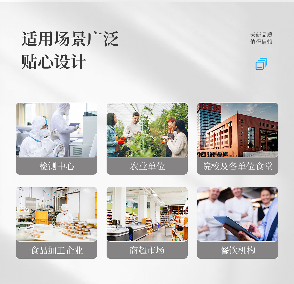| 病害肉診斷:組胺、揮發性鹽基氮、肉制品酸價、水發產品中組胺 | 瘦肉精激素類(獸藥):鹽酸克倫特羅、沙丁胺醇、萊克多巴胺、己烯雌酚、喹乙醇等 | 抗生素殘留類(獸藥):四環素類、硝基呋喃類、磺胺類、沙星類、喹諾酮類、慶大霉素、鏈霉素、阿莫西林、紅霉素等 | 水產品安全類:孔雀石綠、氯霉素、呋喃妥因代謝、呋喃西林代謝、呋喃它酮代謝、呋喃唑酮代謝 |