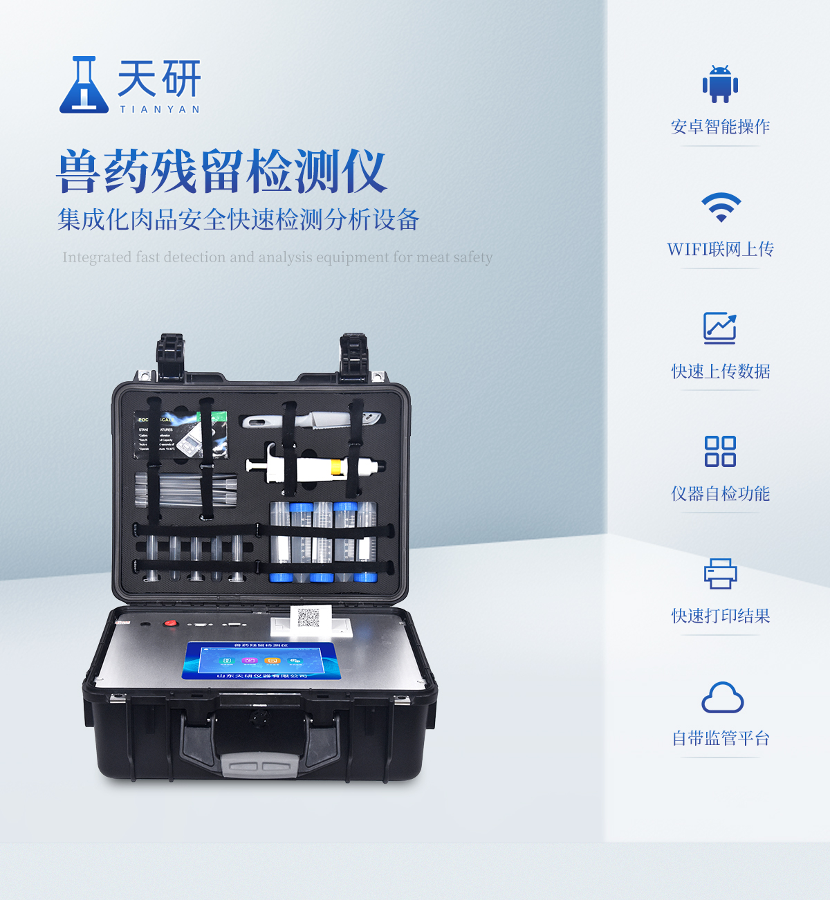 | 安卓智能操作系統(tǒng),采用更加**UI交互界面,儀器具有wifi聯(lián)網(wǎng)上傳、4G聯(lián)網(wǎng)傳輸、GPRS無(wú)線遠(yuǎn)傳、網(wǎng)線連接功能,快速批量上傳數(shù)據(jù)。 | 智能化程度高,儀器具有自檢功能:具有開(kāi)機(jī)自檢和調(diào)零功能,具有自動(dòng)檢測(cè)重復(fù)性功能。 | 新一代高速熱敏打印機(jī),檢測(cè)完成可自動(dòng)打印檢測(cè)報(bào)告和二維碼。 | 儀器帶有監(jiān)管平臺(tái),數(shù)據(jù)可局域網(wǎng)和互聯(lián)網(wǎng)數(shù)據(jù)上傳,檢測(cè)結(jié)果直接傳至食品安全監(jiān)管平臺(tái)。進(jìn)行區(qū)域食品安全監(jiān)管及大數(shù)據(jù)分析處理與數(shù)據(jù)統(tǒng)計(jì),檢測(cè)區(qū)域食品安全長(zhǎng)短期動(dòng)態(tài),達(dá)到食品安全問(wèn)題預(yù)估、預(yù)警 | 一體化便攜式快檢設(shè)備,滿足現(xiàn)場(chǎng)及流動(dòng)檢測(cè)使用需求,能夠在同一軟件下實(shí)現(xiàn)所有檢測(cè)項(xiàng)目的檢測(cè),并可通過(guò)同一窗口直觀顯示檢測(cè)結(jié)果。 | 膠體金模塊檢測(cè)方式:軌道式自動(dòng)傳輸掃描,檢測(cè)完成后自動(dòng)退出檢測(cè)卡。 | 一體化主機(jī),包含食品安全檢測(cè)模塊、多通道農(nóng)藥殘留檢測(cè)模塊、膠體金免疫層析檢測(cè)模塊。 | CT線自動(dòng)識(shí)別,無(wú)需手動(dòng)調(diào)整。 | 儀器具有品類多種類樣品菜單庫(kù),可靈活選擇檢測(cè)樣品,不同的檢測(cè)通道可同時(shí)檢測(cè)不同的樣品項(xiàng)目。。 | 樣品處理簡(jiǎn)單省力,整體操作快速、安全、便捷。 | 儀器具有自身保護(hù)功能,可設(shè)置用戶名及密碼,防止非工作人員操作等。 | 高靈敏度,高檢測(cè)精度,高重復(fù)性精度,掃描式高精度光學(xué)傳感器。 | 儀器具有重新校準(zhǔn)、鎖定、恢復(fù)出廠設(shè)置功能。 | 內(nèi)置強(qiáng)大的數(shù)據(jù)庫(kù),可在儀器上直接選擇樣品名稱、檢測(cè)指標(biāo)、送檢單位等信息,也可在儀器上直接編輯錄入樣品名稱、檢測(cè)指標(biāo)、送檢單位等信息并保存進(jìn)樣品數(shù)據(jù)庫(kù)。 | 儀器具有重新校準(zhǔn)、鎖定、恢復(fù)出廠設(shè)置功能。 | 結(jié)果判定線可修改,對(duì)照值標(biāo)定值可保存,斷電不丟失數(shù)據(jù)。 | 兼容市場(chǎng)上所有的膠體金卡,使用耗材不受限制,極大增強(qiáng)用戶使用體驗(yàn)。 |