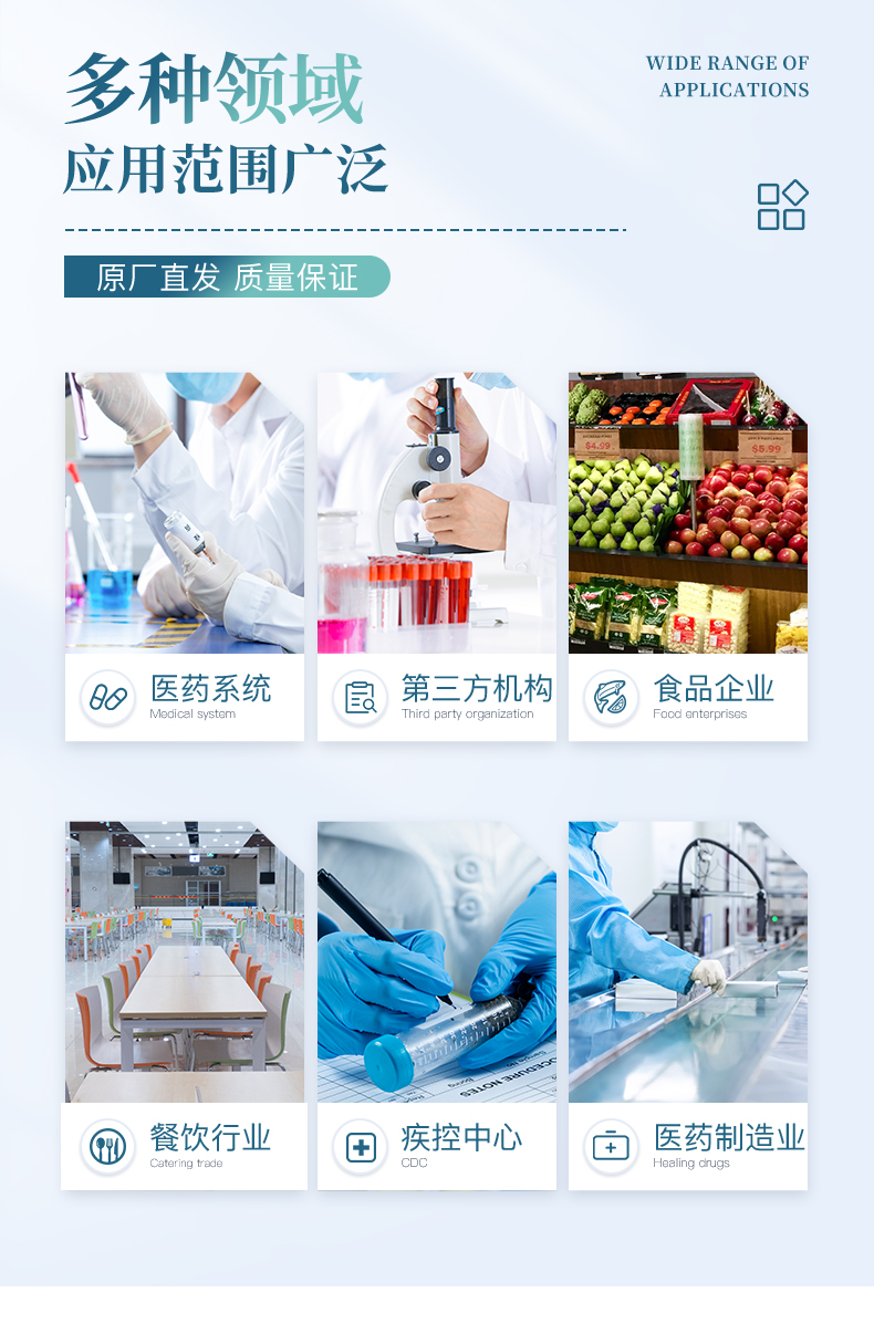 | 衛(wèi)生控制: -食品(HACCP) -廚房、工具、表面(HACCP) -水質(zhì) -(CDC)疾病控制、進(jìn)出口檢驗(yàn)檢疫 -藥品及 化妝品 | 與我們的生活息息相關(guān),例如: 咖啡館、餐廳 ,水源檢測(cè)、制水廠 ,分析實(shí)驗(yàn)室和HACCP診斷 ,農(nóng)產(chǎn)品及相關(guān)加工公司 ,藥廠、藥房、化妝品廠 ,環(huán)境監(jiān)測(cè)機(jī)構(gòu) ,水配送公司 ,消費(fèi)者保護(hù)團(tuán)體、工商管理機(jī)構(gòu) ,室內(nèi)空調(diào)調(diào)節(jié)公司 | 集傳統(tǒng)檢驗(yàn)方法優(yōu)點(diǎn)于一身:培養(yǎng)皿法、 酶法(β-葡萄糖苷酸酶分析)、 -免疫法(抗原搜尋)、基因法(基因搜尋) | 檢驗(yàn)樣本無需任何前處理 :-液態(tài)樣本,固態(tài)樣本和表面樣本均無需前處理 ; | 定性和定量分析 :-搭配檢測(cè)機(jī):100%的定量分析 、肉眼判讀:定性或半定量分析 ; | 簡(jiǎn)單便捷 :簡(jiǎn)單的三個(gè)步驟得到檢測(cè)結(jié)果 ; | 檢驗(yàn)迅速 :是傳統(tǒng)檢驗(yàn)方法速度的2~5倍 ; | 高靈敏性:可以檢測(cè)到1目標(biāo)微生物(理論極值); | 高特異性 :特異性高達(dá)99.999%(理論極值) ; | 檢測(cè)瓶就是實(shí)驗(yàn)室 :微生物檢測(cè)瓶隨時(shí)可用、未受過嚴(yán)格專業(yè)訓(xùn)練的檢測(cè)人員也可隨時(shí)隨地進(jìn)行檢測(cè) ; | 使用后安全丟棄 :和過期藥物同樣處理 ; |