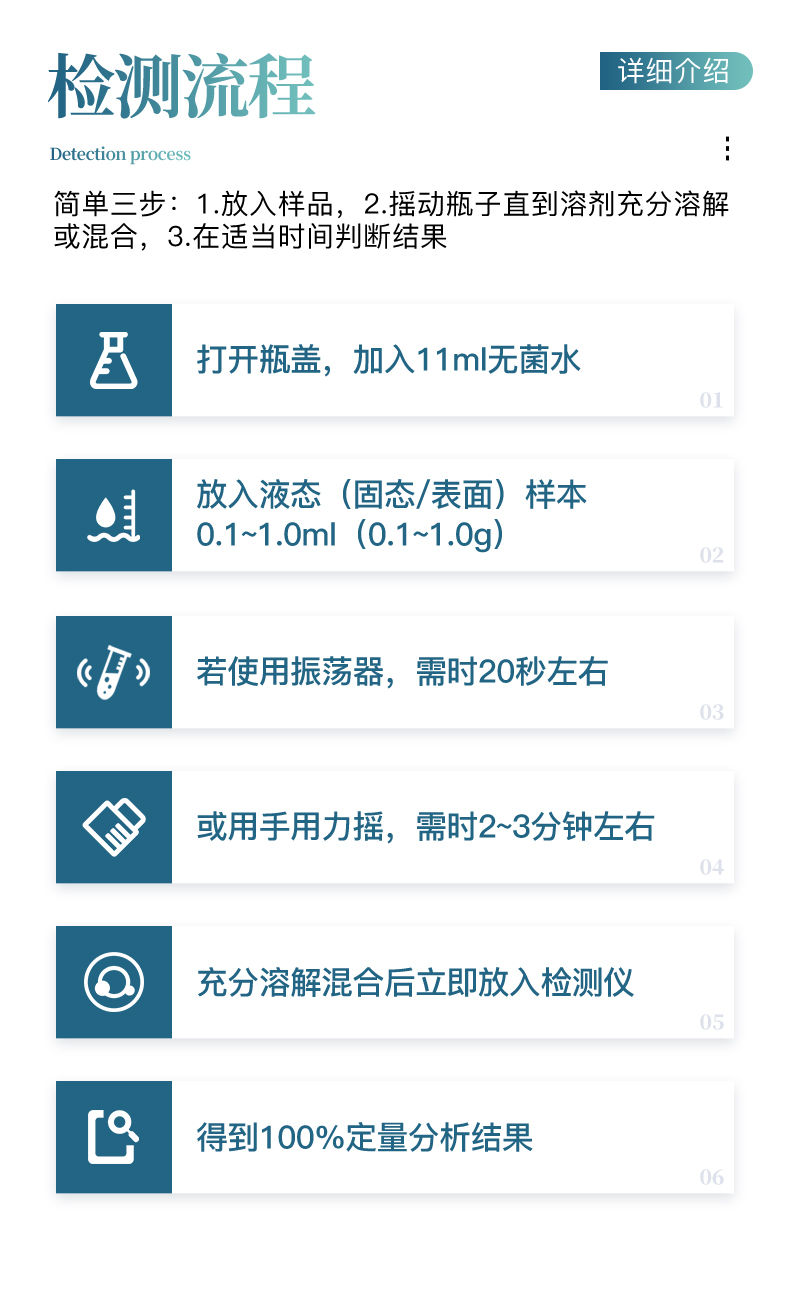 | 第一步:放入樣本 -打開瓶蓋,加入11ml無菌水 -放入液態(tài)(固態(tài)/表面)樣本0.1~1.0ml(0.1~1.0g)-蓋緊瓶蓋 | 第二步:搖動(dòng)瓶子直到溶劑充分溶解或混合 :(充分溶解或混合) -若使用振蕩器,需時(shí)20秒左右; 或用手用力搖,需時(shí)2~3分鐘左右。 | 第三步:在適當(dāng)時(shí)間判讀結(jié)果(請(qǐng)查左表) -使用RVLM微生物檢測(cè)儀: -充分溶解混合后立即放入檢測(cè)儀 -得到100%定量分析結(jié)果 |