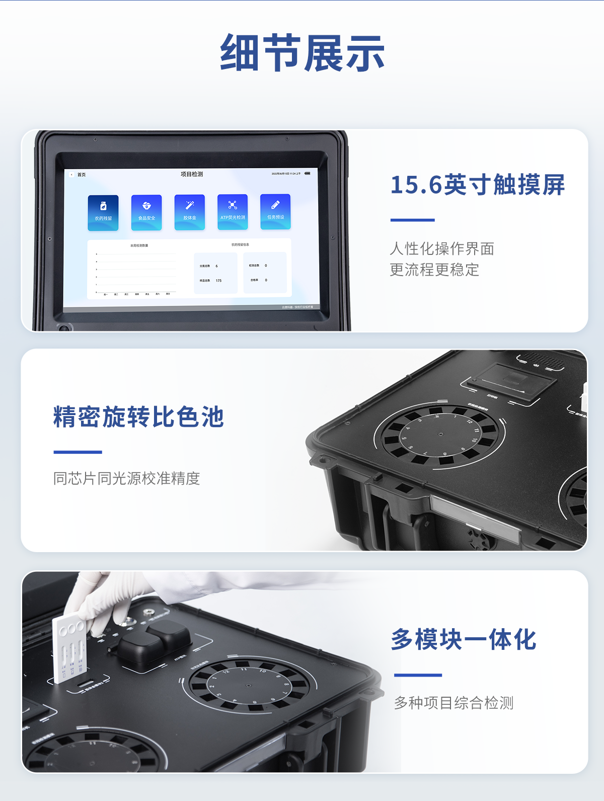 | 功能構(gòu)成:主要包括分光光度模塊、新型農(nóng)殘檢測模塊、膠體金檢測模塊、熒光檢測模塊、數(shù)字化管理模塊等,所有模塊集成一體,可快速檢測200多種食品安全項目,如獸藥殘留、農(nóng)藥殘留、非法添加劑、細(xì)菌數(shù)值等指標(biāo)。 | 檢測樣品種類:餐具及廚房用品、瓜果蔬菜及其制品、水產(chǎn)品及其制品、畜禽產(chǎn)品及其制品、嬰幼兒乳品及奶粉制品、蜂蜜、糧油及其制品、調(diào)味品(食醋、醬油、味精、鹽等)、酒類茶葉及其制品、食用菌、飲料、蛋類藥物殘留(雞蛋,鴨蛋等)、米豆面制品、糖果糕點類(小食品)、薯類及膨化食品、瓶(桶)裝飲用水、添加食用色素的食品、使用添加劑的食品、含有有毒有害物質(zhì)的相關(guān)食品。 | 顯示屏幕:儀器采用15.6英寸液晶觸摸屏顯,搭配運(yùn)行安卓智能操作系統(tǒng),主控芯片采用ARM Cortex-A7,RK3288/4核處理器,主頻1.88Ghz,操作方便,性能更強(qiáng)。 | 供電模式:儀器交直流兩用,直流12V供電,可連接車載電源,配18ah大容量充電鋰電池,電量可實時顯示,無外部電源條件下可持續(xù)工作至少 4 小時。 | 檢測通道:≥24通道;采用精密旋轉(zhuǎn)比色池設(shè)計,使用同芯片同光源校準(zhǔn)精度,解決不同光源之間的誤差值,更加準(zhǔn)確**,采用高精度進(jìn)口四波長冷光源,每個通道均配置 410、520、590、630nm 波長光源,標(biāo)配**的光路切換裝置,**光路切換功能可實現(xiàn)64波長,并且所有檢測項目可實現(xiàn)所有通道同時檢測. | 通訊接口:配備無線通信模塊、4G(APN)通訊模塊、藍(lán)牙傳輸,同時具有雙USB接口以及RJ45網(wǎng)線接口,可以多方式實現(xiàn)數(shù)據(jù)保存及數(shù)據(jù)傳輸。 | 存儲方式:支持U盤存儲,兩個標(biāo)準(zhǔn)USB接口,免驅(qū)動安裝。檢測結(jié)果存儲容量20萬條以上,可生成Excel表格進(jìn)行拷貝,并具有登錄保護(hù)功能。 | 操作系統(tǒng):儀器可在同一檢測界面自動對應(yīng)相關(guān)檢測通道,一次性選擇不少于11個樣品名稱,無需退出界面,節(jié)省操作時間。并可以對每個通道屬性和樣品信息單獨(dú)進(jìn)行編輯,例如送檢單位、人員,檢測人員等,打印時勾選打印顯示。 | 數(shù)據(jù)集成系統(tǒng):設(shè)備首頁自動匯總分析檢測數(shù)據(jù),包含:周檢測數(shù)據(jù)、月檢測數(shù)據(jù),全部檢測總數(shù)量,包含檢測總數(shù),合格數(shù),不合格數(shù),以及相關(guān)柱形分析圖,各項檢測數(shù)據(jù)一目了然,無需電腦查詢,更加快捷直觀。 | 數(shù)據(jù)庫系統(tǒng):十幾項數(shù)據(jù)庫分類管理儀器:包含項目類型、項目數(shù)據(jù)、檢測數(shù)據(jù)、歷史記錄、國標(biāo)信息、曲線信息、采樣信息、檢測信息、受檢信息、復(fù)核信息、圖表信息、光源校準(zhǔn)信息、打印樣式信息、樣品庫信息等等,數(shù)據(jù)庫之間互相協(xié)調(diào)聯(lián)動保證數(shù)據(jù)的真實完整性。同時產(chǎn)品數(shù)據(jù)庫以及歷史檢測記錄支持一鍵檢索功能。 | 限量規(guī)判系統(tǒng):具有限量查詢、添加物質(zhì)合規(guī)判定系統(tǒng)。檢測出結(jié)果后,系統(tǒng)自動調(diào)用系統(tǒng)數(shù)據(jù)庫中相關(guān)國標(biāo)進(jìn)行比對判定,客觀顯示判定結(jié)果是否合格。 | 項目預(yù)設(shè)系統(tǒng):儀器具有任務(wù)預(yù)設(shè)模塊,一鍵提前預(yù)設(shè),給出方便快捷的新檢測方案,每一個任務(wù)分別可以設(shè)置不同的樣品、批次、編號、來源、備注、抽樣信息、檢測信息、受檢信息、復(fù)核信息等更多信息。樣品送檢時一鍵調(diào)取保存信息,并可多次調(diào)取,適用于大批量檢測業(yè)務(wù),可以大大提高檢測效率。 | 數(shù)據(jù)監(jiān)管系統(tǒng):同步對接監(jiān)管平臺,數(shù)據(jù)可局域網(wǎng)和互聯(lián)網(wǎng)數(shù)據(jù)上傳,檢測結(jié)果可直接傳至食品安全監(jiān)管平臺。進(jìn)行區(qū)域食品安全監(jiān)管及大數(shù)據(jù)分析處理與數(shù)據(jù)統(tǒng)計,監(jiān)測區(qū)域食品安全長短期動態(tài)及問題預(yù)估、預(yù)警 | 全新打印系統(tǒng):內(nèi)置全新打印機(jī),新創(chuàng)自定義打印方式,可按需靈活勾選控制:產(chǎn)品合格證(國家農(nóng)業(yè)部標(biāo)準(zhǔn)要求),二維碼,抽樣信息、檢測信息,受檢信息、復(fù)核信息、抽樣日期、檢測日期等信息的打印。 | A4紙版本報告打印功能:設(shè)備擁有兩種結(jié)果展示方式,可以自動生成A4打印模板和小票打印模板兩種樣式,可通過WiFi及網(wǎng)線等方式連接外置打印機(jī)可進(jìn)行打印。 | 膠體金檢測模塊:采用單通道CMOS成像處理技術(shù)及膠體金免疫層析技術(shù),可讀取膠體金卡數(shù)據(jù),自動采集、處理分析,將檢測結(jié)果顯示,并可根據(jù)參考限值自動判斷檢測結(jié)果,可檢測常見的獸藥殘留、生物毒素、抗生素、違禁添加物等。 | 可即時檢測單聯(lián)卡及三聯(lián)卡; | 檢測通道:2個通道; | 檢測方式:消線法和比色法; | 顯示模式:陰性或陽性; | 曲線形式:插入式掃描方式,顯示金標(biāo)卡圖像,實時生成、識別CT曲線圖,無需手動調(diào)整。兼容市場上其他金標(biāo)卡,使用耗材不受限制。 | 熒光檢測模塊:快速檢測水質(zhì)中微生物、固體物細(xì)菌含量。利用“熒光素酶—熒光素體系”