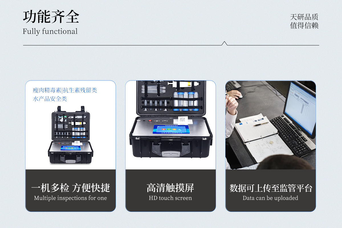 | 安卓智能操作系統,采用更加**和人性化操作,儀器具有網線連接、wifi聯網上傳、4G無線遠傳功能,快速上傳數據。 | 智能化程度高,儀器具有自檢功能:具有開機自檢和調零功能,具有自動檢測重復性功能。 | 新一代高速熱敏打印機,檢測完成可自動打印檢測報告和二維碼。 | 儀器帶有監管平臺。數據可局域網和互聯網數據上傳,檢測結果直接傳至食品安全監管平臺。進行區域食品安全監管及大數據分析處理與數據統計,檢測區域食品安全長短期動態,達到食品安全問題預估、預警。 | 一體化便攜式快檢設備,滿足現場及流動檢測使用需求,能夠在同一軟件下實現所有檢測項目的檢測,并可通過同一窗口直觀顯示檢測結果。 | 膠體金模塊檢測方式:軌道式自動傳輸掃描,檢測完成后自動退出檢測卡。 | CT線自動識別,無需手動調整。 | 儀器具有品類多種類樣品菜單庫,可靈活選擇檢測樣品,不同的檢測通道可同時檢測不同的樣品項目。 | 樣品處理簡單省力,整體操作快速、安全、便捷。 | 儀器具有自身保護功能,可設置用戶名及密碼,防止非工作人員操作等。 | 高靈敏度,高檢測精度,高重復性精度,掃描式高精度光學傳感器。 | 內置強大的數據庫,可在儀器上直接選擇樣品名稱、檢測指標、送檢單位等信息,也可在儀器上直接編輯錄入樣品名稱、檢測指標、送檢單位等信息并保存進樣品數據庫。 | 儀器具有重新校準、鎖定、恢復出廠設置功能。 | 支持U盤存儲。 結果判定線可修改,對照值標定值可保存,斷電不丟失數據。 | 兼容市場上所有的膠體金卡,使用耗材不受限制,極大增強用戶使用體驗。 |