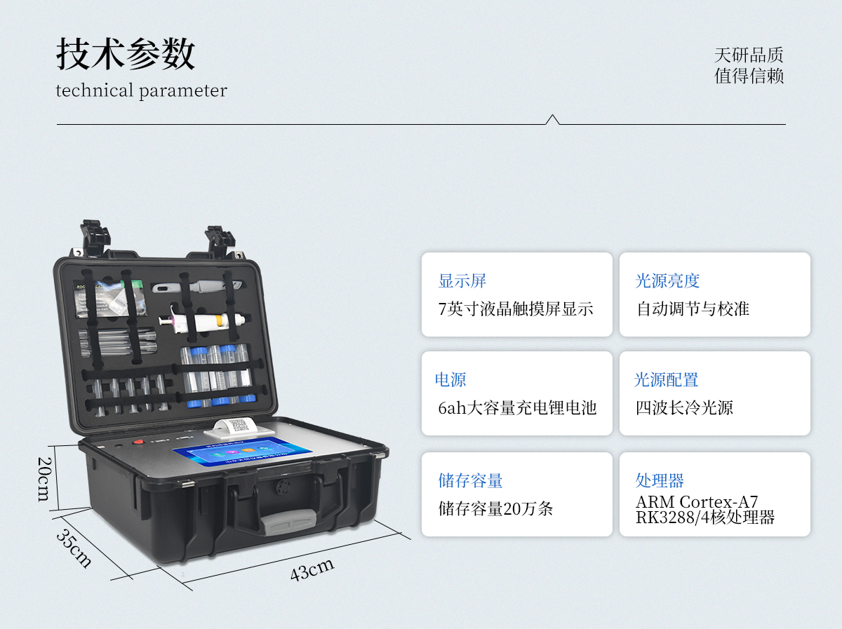 | 主控芯片采用ARM Cortex-A7,RK3288/4核處理器,主頻1.88Ghz,運轉速度更快速,穩定性更強。 | 顯示方式:7英寸液晶觸摸屏顯示,人性化中文操作界面,讀數直觀、簡單。 | 交直流兩用,直流12V供電,可連接車載電源,可配6ah大容量充電鋰電池,方便戶外流動測試。 | 光源亮度自動調節與校準 | 智能恒流穩壓,光強自動校準,長時間連續工作光源無溫漂現象。 | 內置新國家限量標準,與所測結果進行現場比對,并持續更新標準。 | 不間斷進樣,連續檢測 | 樣本編號自動累加。 | 檢測項目可擴充。 | 檢測結果可批量打印,批量上傳。 | 檢測結果為Excel表格,連接電腦即可拷貝。 | 檢測結果存儲容量20萬條 | 標準USB接口,免驅動安裝。 | 固件可升級 |