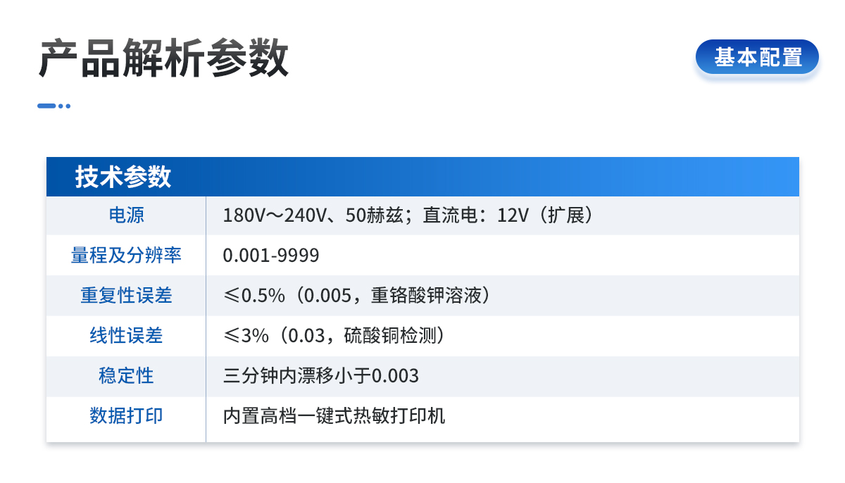 | 電源:交流電:180V~240V、50赫茲;直流電:12V(擴展) | 量程及分辨率:0.001-9999 | 穩定性:三分鐘內漂移小于0.003 | 線性誤差:≤3%(0.03,硫酸銅檢測) | 重復性誤差:≤0.5%(0.005,重鉻酸鉀溶液) | 靈敏度:紅光≥4.5 ×10-5 藍光≥3.17×10-3 | 波長范圍:紅光620±8nm 藍光440±8nm | 測試速度:測一個土樣有機質≤60分鐘(含前處理時間) | 可同時檢測8個土樣≤個小時(含前處理時間) | 數據打印:內置高檔一鍵式熱敏打印機(國內首家**設計) |