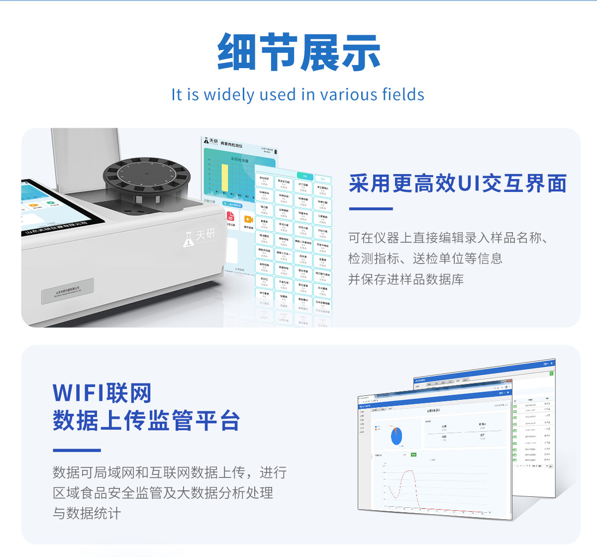 | 儀器采用手提式一體化系統(tǒng)檢測技術(shù),將分光光度模塊、新型農(nóng)殘檢測模塊、數(shù)字化管理模塊、無線通訊模塊高度集成于一體,支持檢測200種食品安全檢測項目,同時預(yù)留升級檢測方法。 | 儀器檢測模塊標(biāo)準化、智能化,檢測項目可隨意自由組合。檢測箱體內(nèi)置多個標(biāo)準檢測單元,檢測模塊可以調(diào)整配置。 | 顯示屏幕:儀器采用10.1英寸豎向液晶觸摸屏顯,搭配運行安卓智能操作系統(tǒng),主控芯片采用ARM Cortex-A7,RK3288/4核處理器,主頻1.88Ghz,操作方便,性能更強。 | 檢測通道:≥12通道;采用精密旋轉(zhuǎn)比色池設(shè)計,使用同芯片同光源校準精度,解決不同光源之間的誤差值,更加準確**。(1-12通道間誤差0.1%,**號:ZL202022821055.2) | 儀器光源:高精度進口四波長冷光源,每個通道均配置 410、520、590、630nm 波長光源,標(biāo)配**的光路切換裝置,**光路切換功能可實現(xiàn)64波長,并且所有檢測項目可實現(xiàn)所有通道同時檢測。 | 設(shè)備可一鍵校準,自動保存校準數(shù)據(jù),自動對比校驗,得到精準光源,采用Android SP存儲數(shù)據(jù),光源數(shù)據(jù)永不丟失,方便每一次使用。 | 通訊接口:配備無線通信模塊、4G(APN)通訊模塊、藍牙傳輸,同時具有雙USB接口以及RJ45網(wǎng)線接口,可以多方式實現(xiàn)數(shù)據(jù)保存及數(shù)據(jù)傳輸 | 存儲方式:支持U盤存儲,標(biāo)準USB接口,免驅(qū)動安裝。檢測結(jié)果存儲容量20萬條以上,可生成Excel表格進行拷貝,并具有登錄保護功能。 | 智能化操作系統(tǒng): | 1)操作系統(tǒng):儀器可在同一檢測界面自動對應(yīng)相關(guān)檢測通道,一次性選擇1-12個樣品名稱,無需退出界面,節(jié)省操作時間。并可以對每個通道屬性和樣品信息單獨進行編輯,例如送檢單位、人員,檢測人員等,打印時勾選打印顯示。 | 2)數(shù)據(jù)集成系統(tǒng):設(shè)備首頁自動匯總分析檢測數(shù)據(jù),包含:周檢測數(shù)據(jù)、月檢測數(shù)據(jù),全部檢測總數(shù)量,均包含檢測總數(shù),合格數(shù),不合格數(shù),以及相關(guān)柱形分析圖,各項檢測數(shù)據(jù)一目了然,無需電腦查詢,更加快捷直觀。 | 3)數(shù)據(jù)庫系統(tǒng):十幾項數(shù)據(jù)庫分類管理儀器:包含項目類型、項目數(shù)據(jù)、檢測數(shù)據(jù)、歷史記錄、國標(biāo)信息、曲線信息、采樣信息、檢測信息、受檢信息、復(fù)核信息、圖表信息、光源校準信息、打印樣式信息、樣品庫信息等等,數(shù)據(jù)庫之間互相協(xié)調(diào)聯(lián)動保證數(shù)據(jù)的真實完整性。同時產(chǎn)品數(shù)據(jù)庫以及歷史檢測記錄支持一鍵檢索功能。 | 4)限量規(guī)判系統(tǒng):具有限量查詢、添加物質(zhì)合規(guī)判定系統(tǒng)。檢測出結(jié)果后,系統(tǒng)自動調(diào)用系統(tǒng)數(shù)據(jù)庫中相關(guān)國標(biāo)進行比對判定,客觀顯示判定結(jié)果是否合格。 | 5)項目預(yù)設(shè)系統(tǒng):儀器具有任務(wù)預(yù)設(shè)模塊,一鍵提前預(yù)設(shè),給出方便快捷的新檢測方案,每一個任務(wù)分別可以設(shè)置不同的樣品、批次、編號、來源、備注、抽樣信息、檢測信息、受檢信息、復(fù)核信息等更多信息。樣品送檢時一鍵調(diào)取保存信息,并可多次調(diào)取,大大提高檢測效率。 | 6)數(shù)據(jù)監(jiān)管系統(tǒng):同步對接監(jiān)管平臺,數(shù)據(jù)可局域網(wǎng)和互聯(lián)網(wǎng)數(shù)據(jù)上傳,檢測結(jié)果可選擇直接傳至食品安全監(jiān)管平臺。進行區(qū)域食品安全監(jiān)管及大數(shù)據(jù)分析處理與數(shù)據(jù)統(tǒng)計,檢測區(qū)域食品安全長短期動態(tài),達到食品安全問題預(yù)估、預(yù)警。 | 7)打印系統(tǒng):內(nèi)置全新打印機,新創(chuàng)自定義打印方式,可按需靈活勾選控制:產(chǎn)品合格證(國家農(nóng)業(yè)部標(biāo)準要求),二維碼,抽樣信息、檢測信息,受檢信息、復(fù)核信息、抽樣日期、檢測日期等信息的打印。 | 供電模式:儀器交直流兩用,直流12V供電,可連接車載電源,可配6ah大容量充電鋰電池,電量可實時顯示,方便戶外流動測試。 | 膠體金檢測模塊:采用雙通道CMOS成像處理技術(shù)及膠體金免疫層析技術(shù),可同時讀取雙膠體金卡數(shù)據(jù),自動采集、處理分析,將檢測結(jié)果顯示,并可根據(jù)參考限值自動判斷檢測結(jié)果,可檢測常見的獸藥殘留、生物毒素、抗生素、違禁添加物等。 | 1)探測技術(shù):CMOS成像探測; | 2)檢測通道:1個通道; | 3)檢測方式:消線法和比色法; | 4)顯示模式:陰性或陽性; | 5)曲線形式:軌道式掃描方式,顯示金標(biāo)卡圖像,實時生成、識別CT曲線圖,無需手動調(diào)整,完成檢測后自動退出檢測卡。兼容市場上其他金標(biāo)卡,使用耗材不受限制。 | 儀器加入遠程升級功能,可定向分客戶分儀器更新,開機后自動更新,客戶無需任何操作,即可升級全新項目。做到了無需退換機器即可實現(xiàn)實時遠程升級檢測儀器。 |
