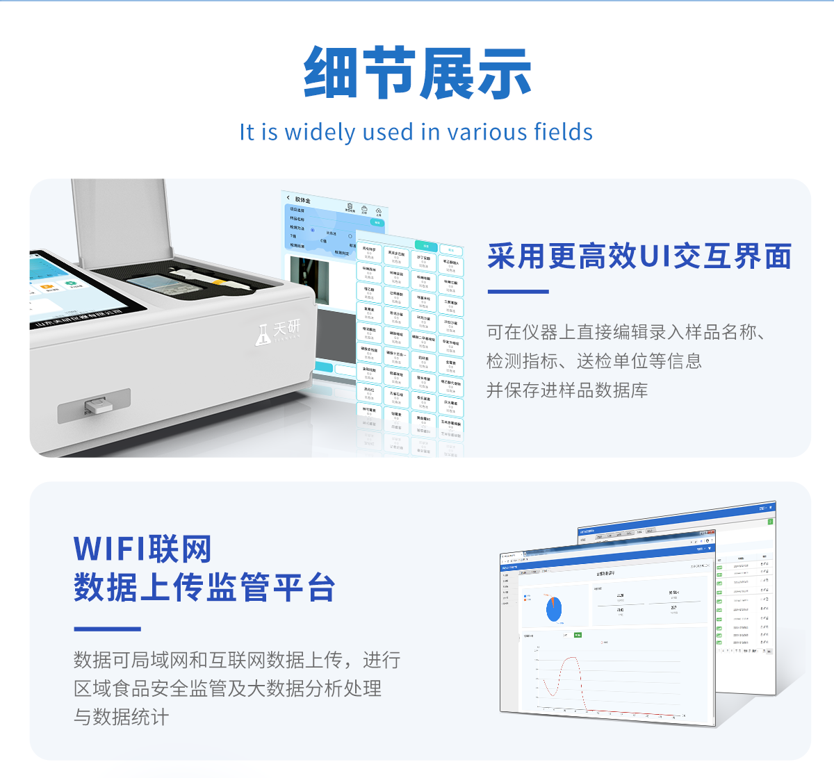 | 安卓智能操作系統(tǒng),采用更加**UI交互界面,儀器具有wifi聯(lián)網(wǎng)上傳、4G聯(lián)網(wǎng)傳輸、GPRS無線遠(yuǎn)傳、網(wǎng)線連接功能,快速批量上傳數(shù)據(jù)。 | 智能化程度高,儀器具有自檢功能:具有開機(jī)自檢和調(diào)零功能,具有自動(dòng)檢測重復(fù)性功能。 | 新一代高速熱敏打印機(jī),檢測完成可自動(dòng)打印檢測報(bào)告和二維碼。 | 儀器帶有監(jiān)管平臺,數(shù)據(jù)可局域網(wǎng)和互聯(lián)網(wǎng)數(shù)據(jù)上傳,檢測結(jié)果直接傳至食品安全監(jiān)管平臺。進(jìn)行區(qū)域食品安全監(jiān)管及大數(shù)據(jù)分析處理與數(shù)據(jù)統(tǒng)計(jì),檢測區(qū)域食品安全長短期動(dòng)態(tài),達(dá)到食品安全問題預(yù)估、預(yù)警 | 一體化便攜式快檢設(shè)備,滿足現(xiàn)場及流動(dòng)檢測使用需求,能夠在同一軟件下實(shí)現(xiàn)所有檢測項(xiàng)目的檢測,并可通過同一窗口直觀顯示檢測結(jié)果。 | 膠體金模塊檢測方式:軌道式自動(dòng)傳輸掃描,檢測完成后自動(dòng)退出檢測卡。 | 一體化主機(jī),包含食品安全檢測模塊、多通道農(nóng)藥殘留檢測模塊、膠體金免疫層析檢測模塊。 | CT線自動(dòng)識別,無需手動(dòng)調(diào)整。 | 儀器具有品類多種類樣品菜單庫,可靈活選擇檢測樣品,不同的檢測通道可同時(shí)檢測不同的樣品項(xiàng)目。。 | 樣品處理簡單省力,整體操作快速、安全、便捷。 | 儀器具有自身保護(hù)功能,可設(shè)置用戶名及密碼,防止非工作人員操作等。 | 高靈敏度,高檢測精度,高重復(fù)性精度,掃描式高精度光學(xué)傳感器。 | 儀器具有重新校準(zhǔn)、鎖定、恢復(fù)出廠設(shè)置功能。 | 內(nèi)置強(qiáng)大的數(shù)據(jù)庫,可在儀器上直接選擇樣品名稱、檢測指標(biāo)、送檢單位等信息,也可在儀器上直接編輯錄入樣品名稱、檢測指標(biāo)、送檢單位等信息并保存進(jìn)樣品數(shù)據(jù)庫。 | 儀器具有重新校準(zhǔn)、鎖定、恢復(fù)出廠設(shè)置功能。 | 結(jié)果判定線可修改,對照值標(biāo)定值可保存,斷電不丟失數(shù)據(jù)。 | 兼容市場上所有的膠體金卡,使用耗材不受限制,極大增強(qiáng)用戶使用體驗(yàn)。 |